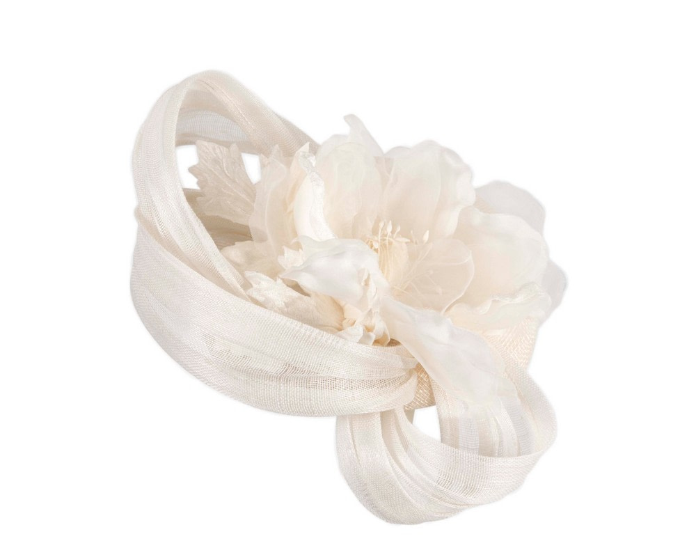 Astonishing cream fascinator, hand made in Melbourne. Tall cream pillbox, draped in matching silk abaca, topped with large silk flower and placed on the headband. A perfect choice for Melbourne Cup and spring racing carnivals.