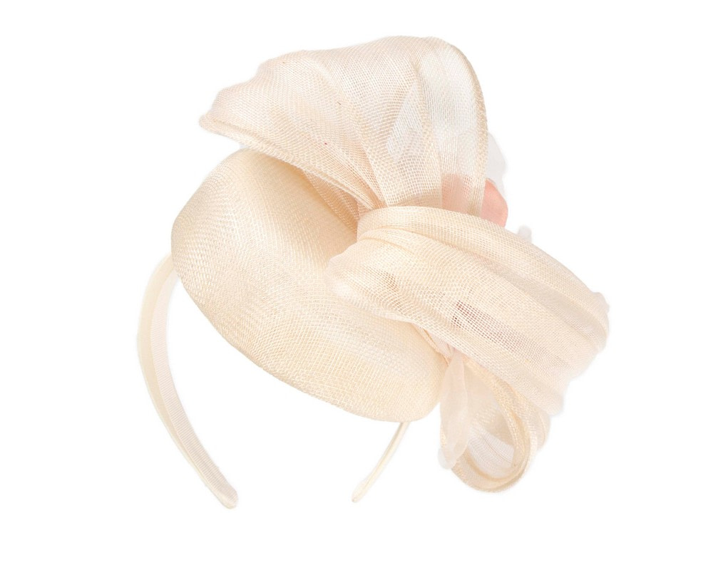 Astonishing ivory cream fascinator, hand made in Melbourne. Tall cream pillbox, draped in matching silk abaca, topped with large pink silk flower and placed on the headband. A perfect choice for Melbourne Cup and spring racing carnivals.