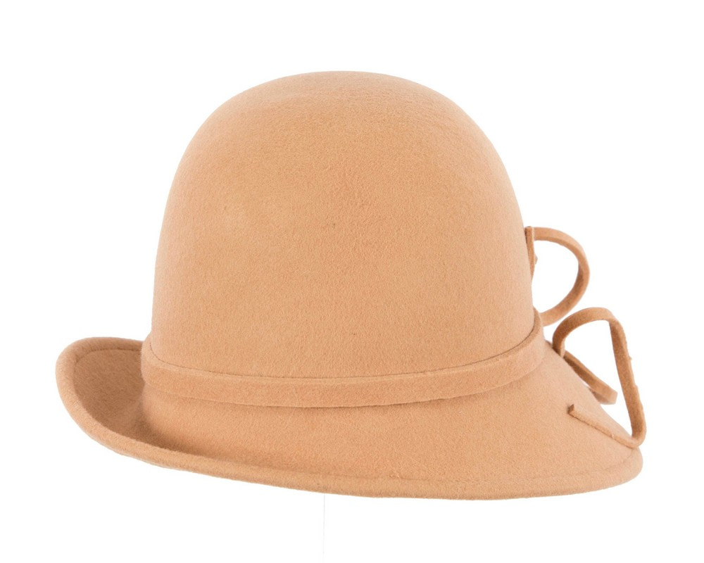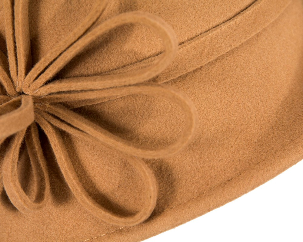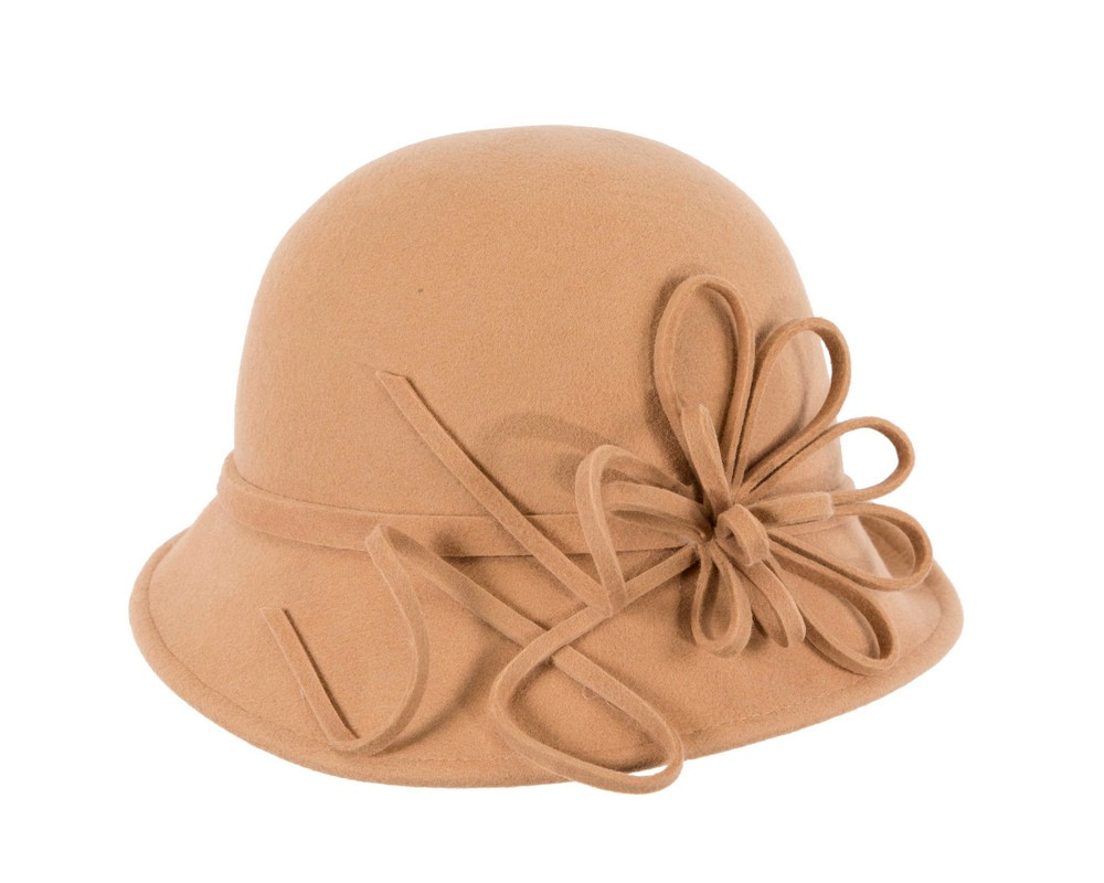 Classic beige felt cloche hat and hand-made felt loops and flower.
