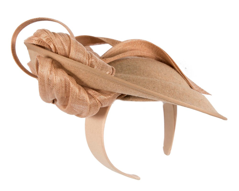 Large beige plate with stylish abaca bow placed on the headband. Hand-made in Melbourne by our experienced milliners, this latest Fillies Collection creation will be a great addition to your winter racing outfit.