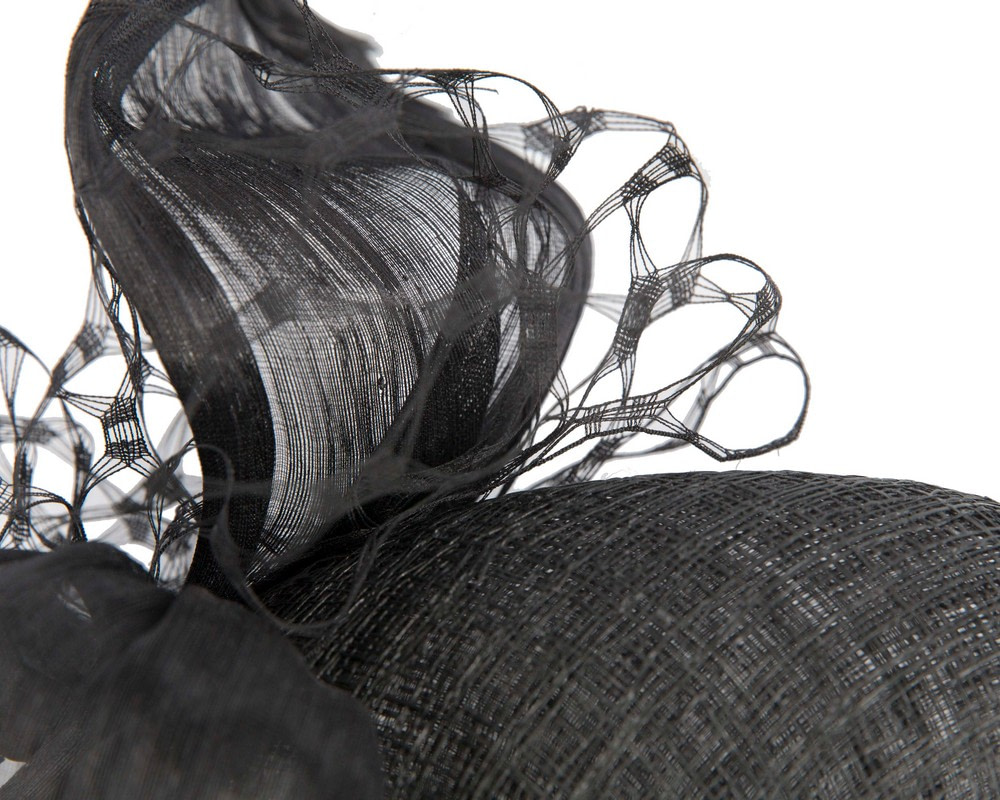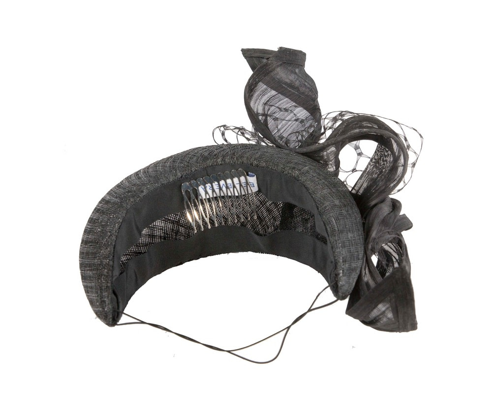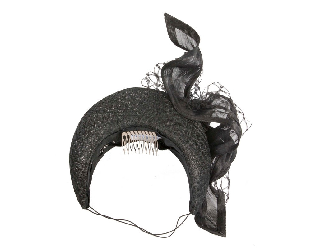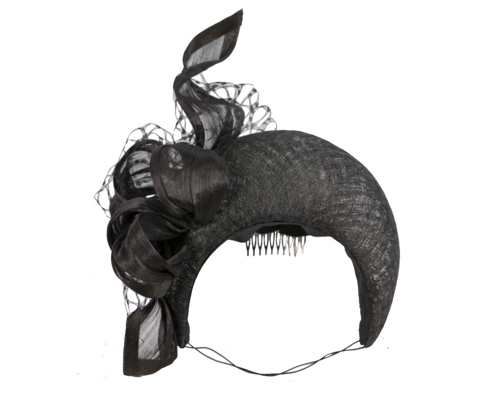 Bespoke creation from Melbourne designer BELIEVERA. Hand-sculpted wide black sinamay headband decorated with netting and silk abaca loops.