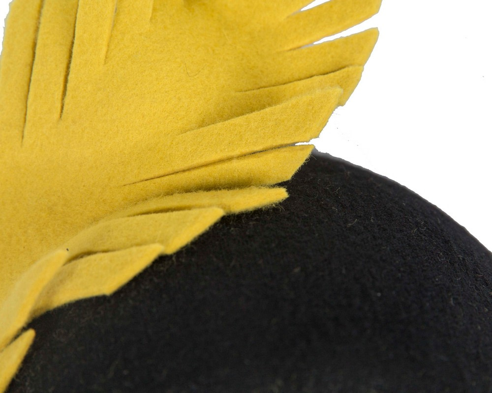 Wide black headband made from wool fabric and decorated with contrast yellow felt leaf
