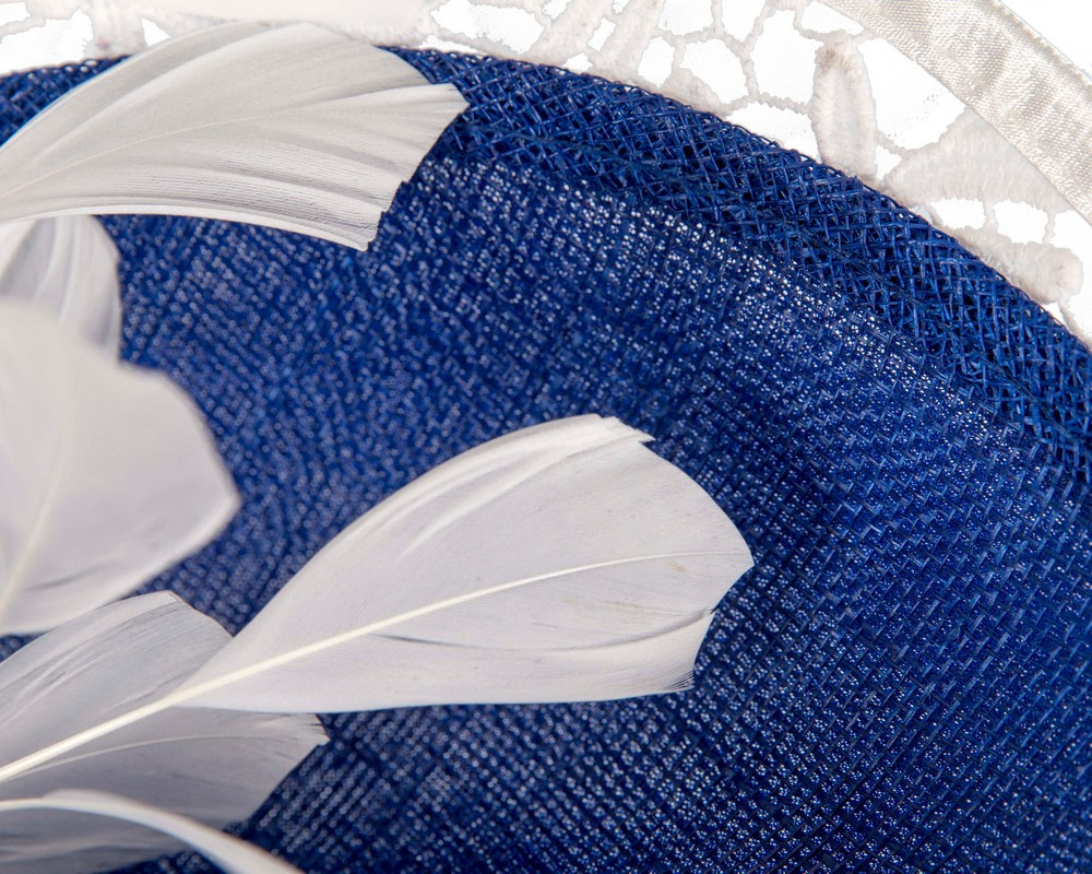 Another bespoke creation from Fillies Collection milliners. Stylish royal blue sinamay base decorated with contrast white lace, silk abaca and rich feather cocktail.