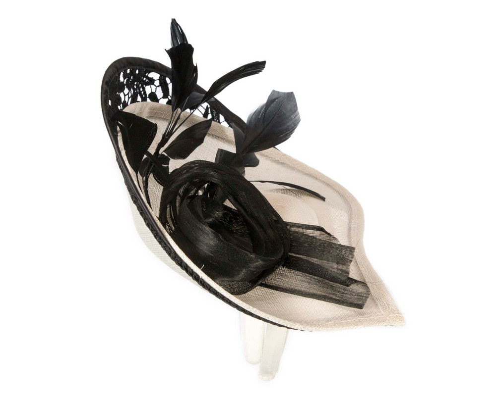 Another bespoke creation from Fillies Collection milliners. Stylish cream sinamay base decorated with contrast black lace, silk abaca and rich feather cocktail.
