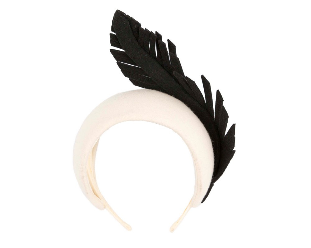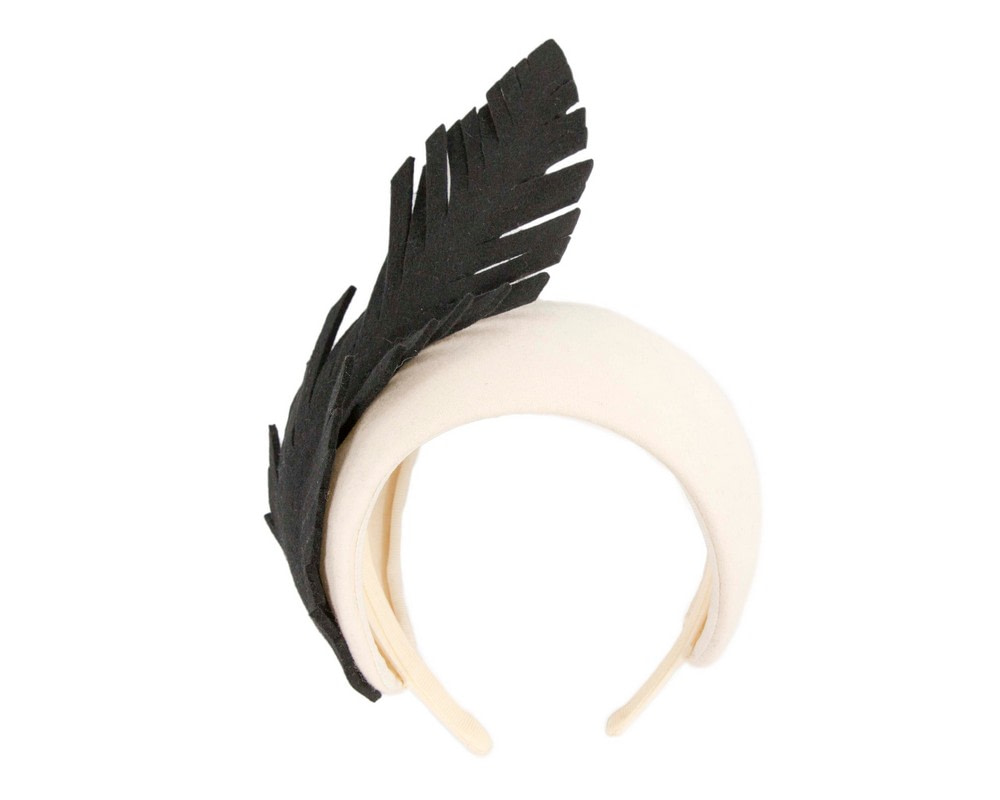 Wide cream headband made from wool fabric and decorated with contrast black felt leaf