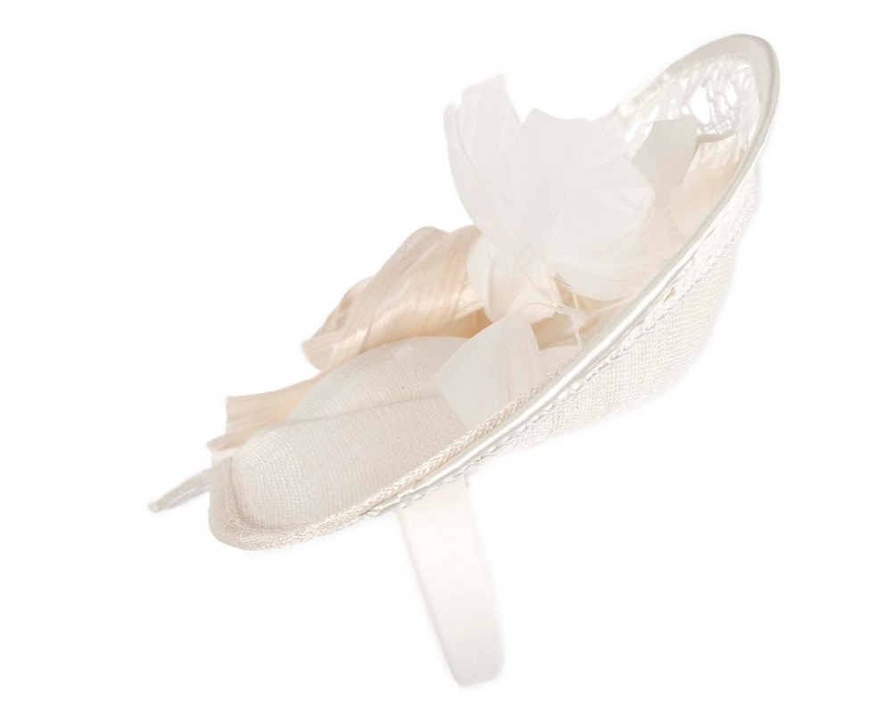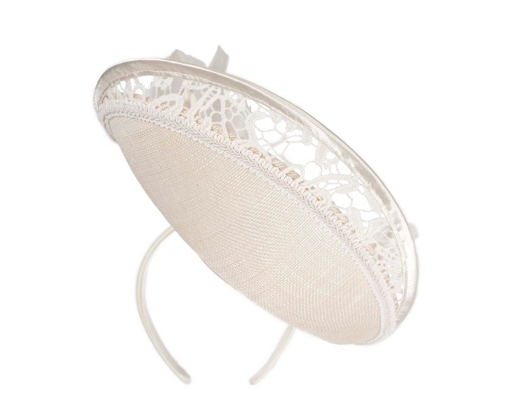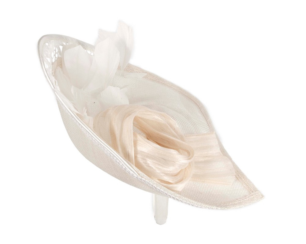Another bespoke creation from Fillies Collection milliners. Stylish cream sinamay base decorated with lace, silk abaca and rich feather cocktail.