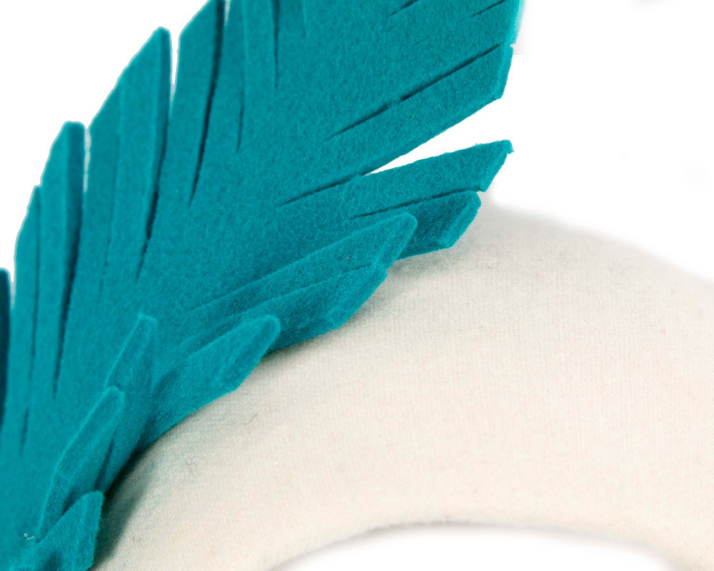 Wide cream headband made from wool fabric and decorated with contrast turquoise felt leaf