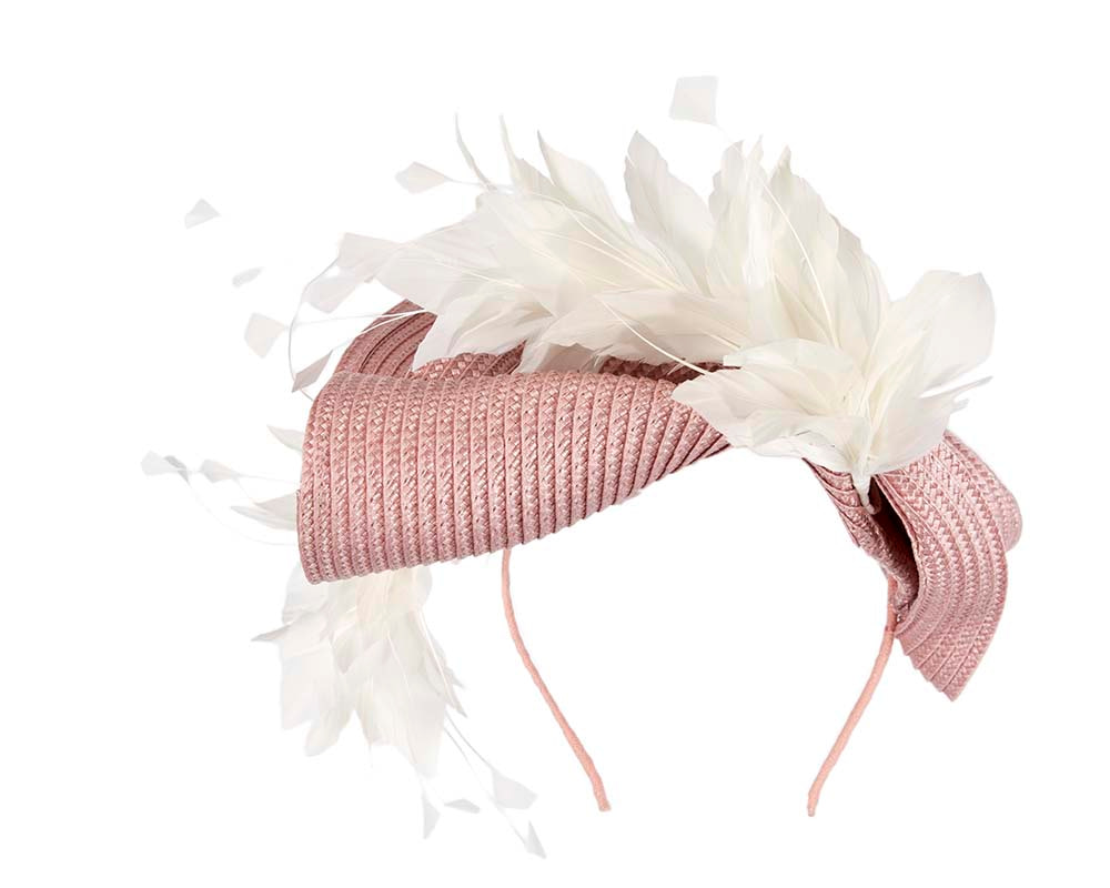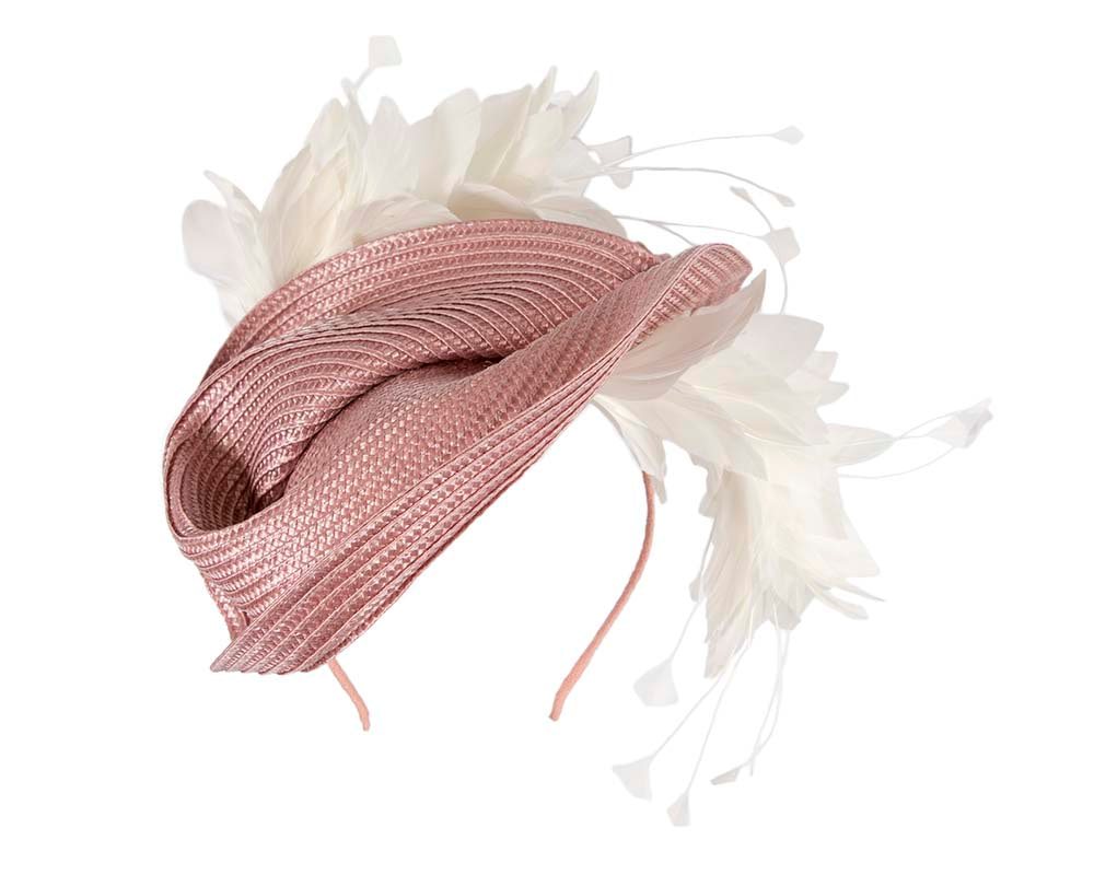 Sculptured dusty pink braid base decorated with white feather flowers. This fascinator will be a great addition to your next spring racing outfit.