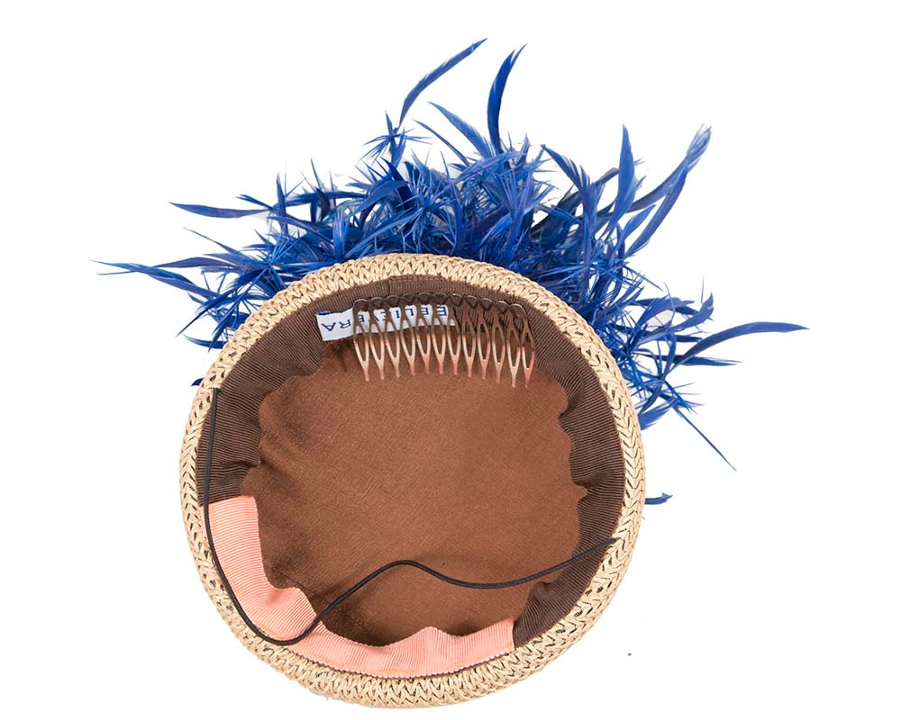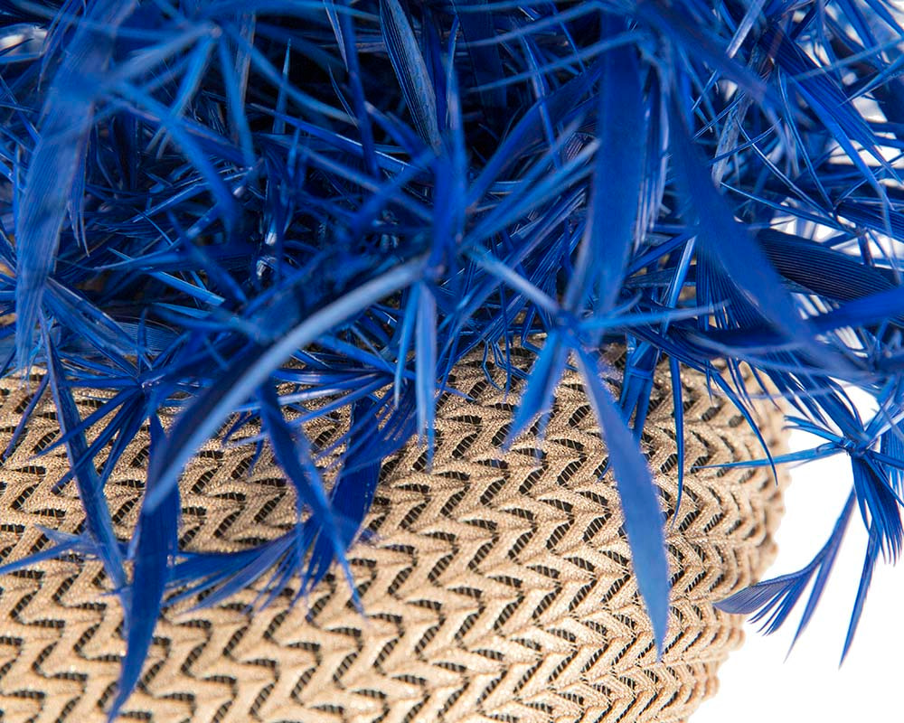 This exclusive BELIEVERA fascinator is a one-of-a-kind creation, meaning you’ll be the only one to own this stunning piece. Handcrafted in Australia, it features a vibrant burst of blue feathers atop a golden round woven base, ensuring you make a bold and elegant statement at your next event.
