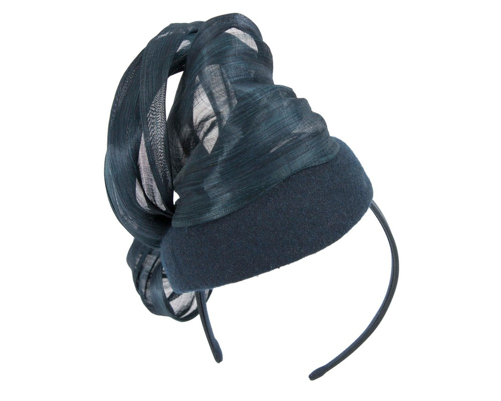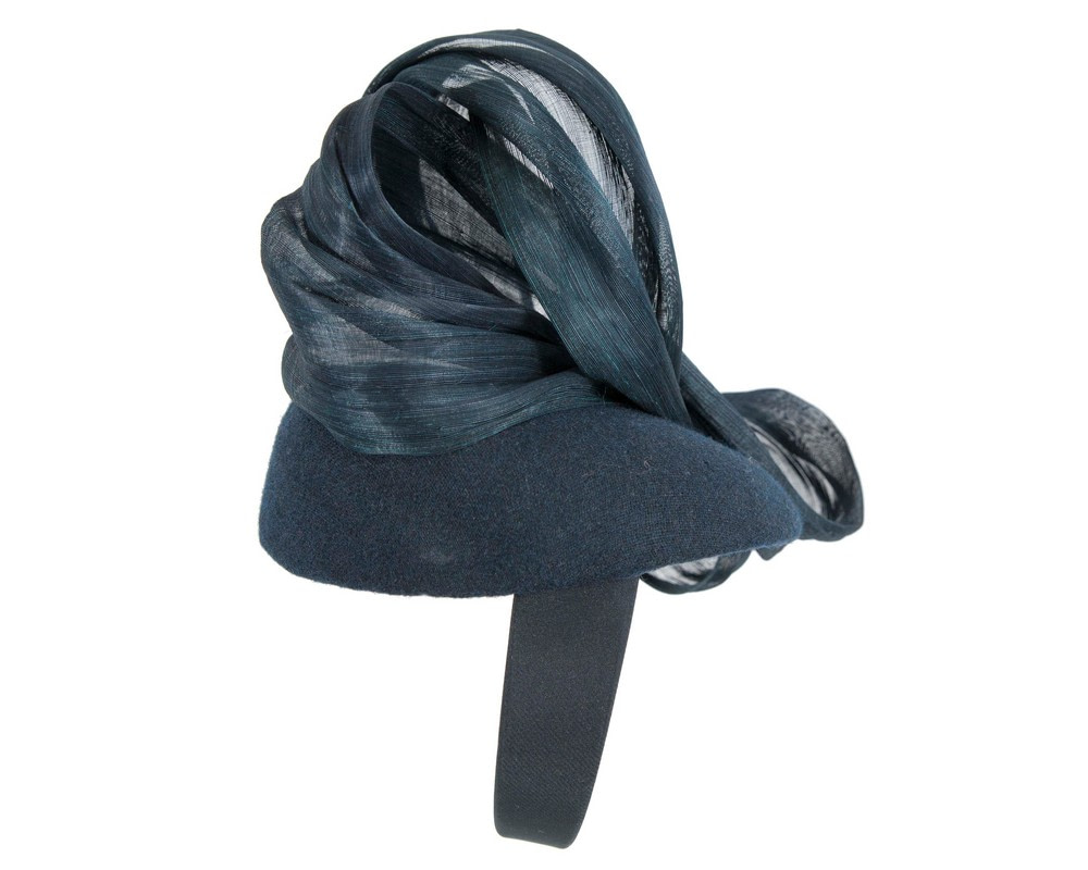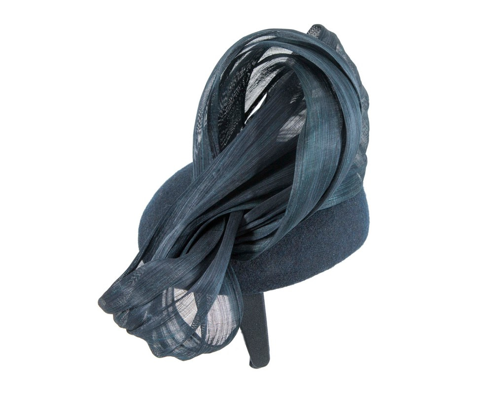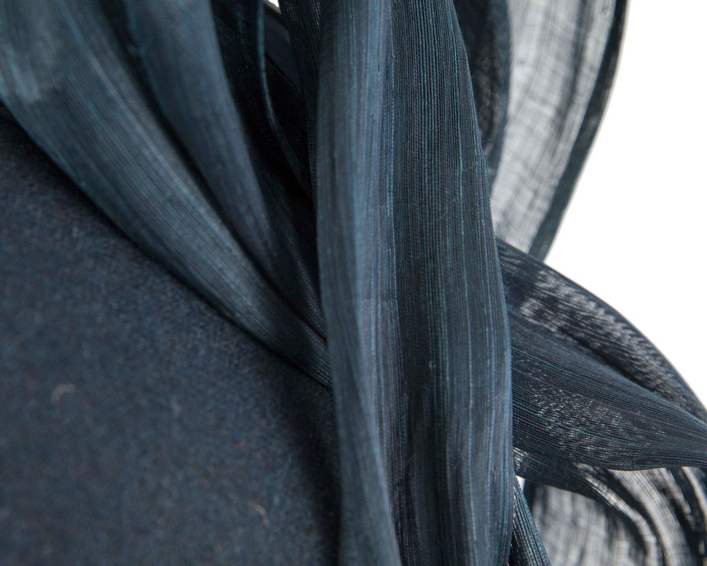 Navy woolen pillbox decorated with large bow made from real silk abaca. Hand made in Melbourne to complete your winter racing outfit.