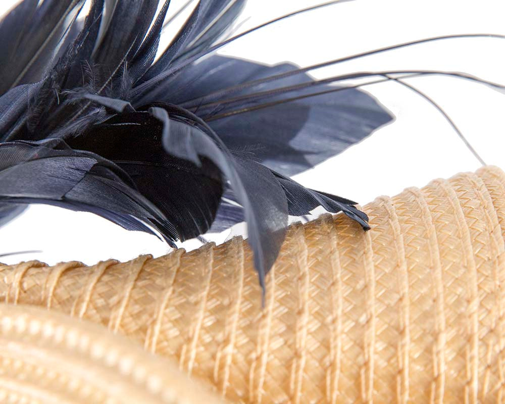 Sculptured nude straw braid base decorated with navy feather flowers. This fascinator will be a great addition to your next spring racing outfit.