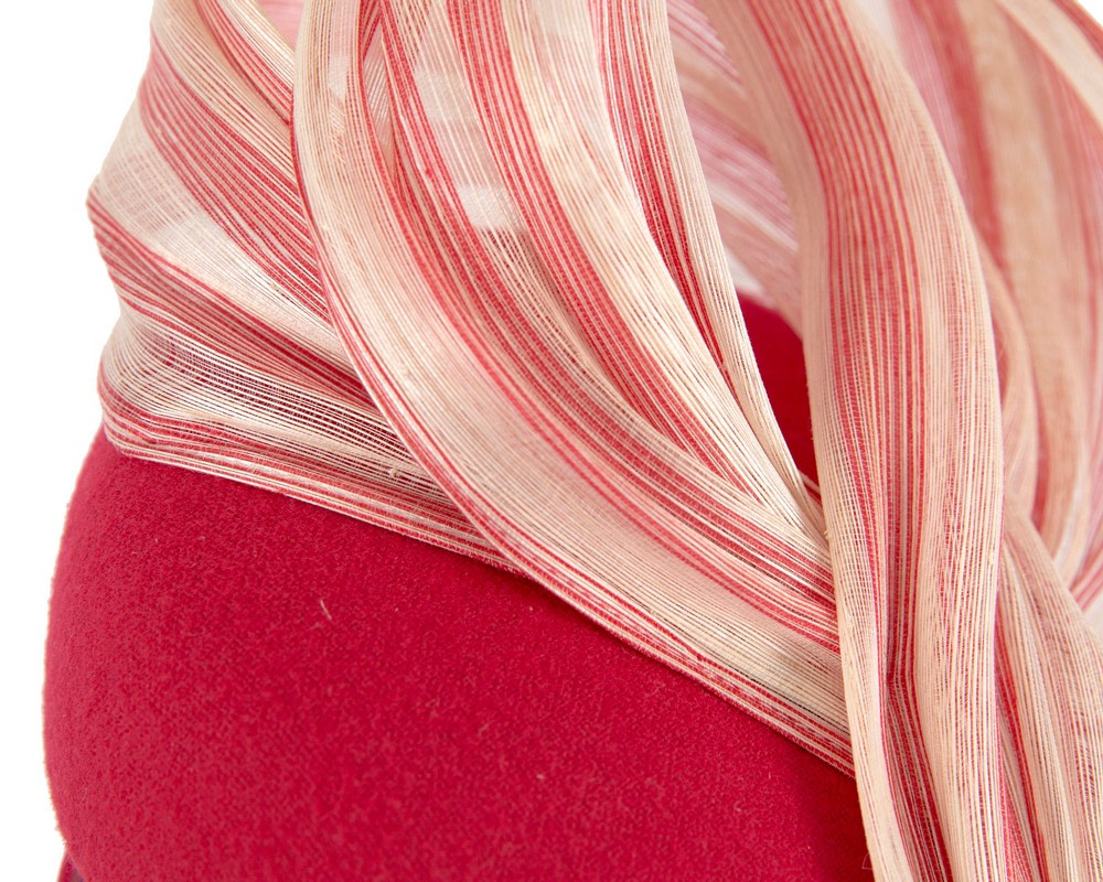 Red woolen pillbox decorated with large stripy cream and red bow made from real silk abaca. Hand made in Melbourne to complete your winter racing outfit.