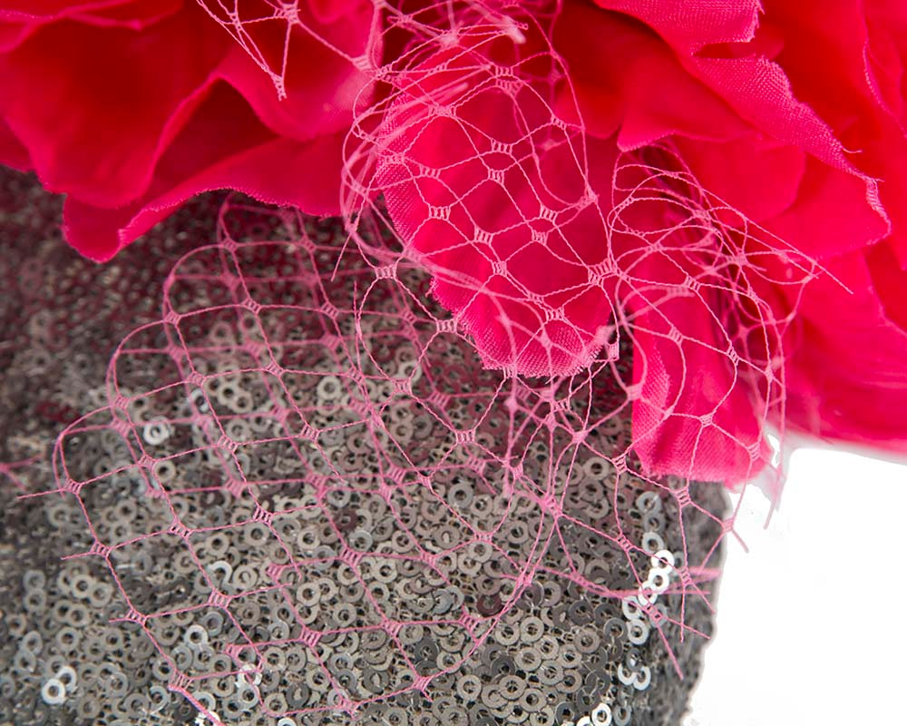 Add glamour and sophistication to your event look with this dazzling fascinator by BELIEVERA. Handcrafted in Australia, this one-of-a-kind headpiece features a sparkling silver sequined base that adds a touch of luxury and shine. The striking hot pink flowers create a bold contrast, while the delicate veil adds an extra layer of elegance.