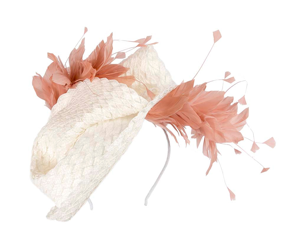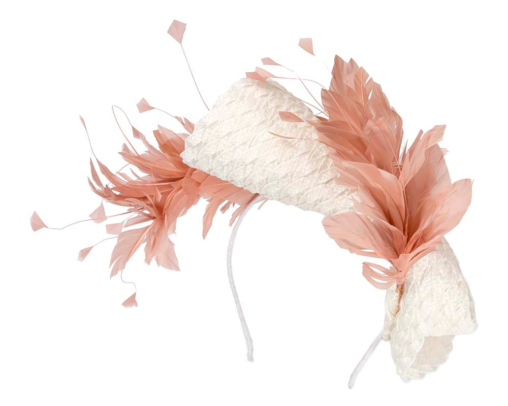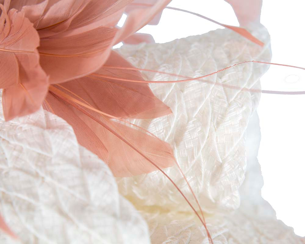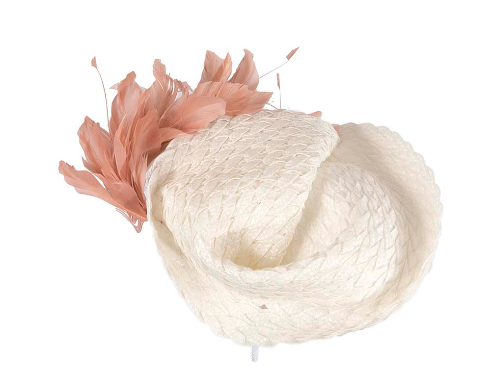 Sculptured white braid base decorated with dusty pink feather flowers. This fascinator will be a great addition to your next spring racing outfit.