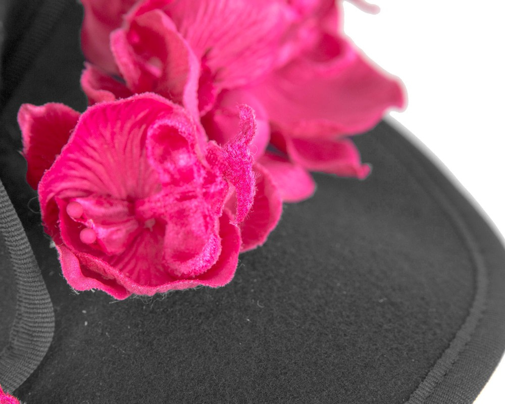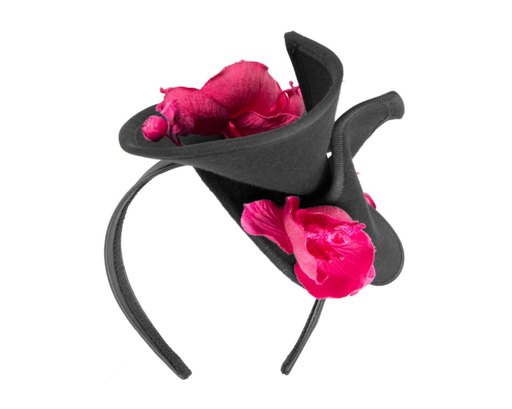 Elevate your style with our exquisite Sculptured Black and Fuchsia Felt Fascinator, meticulously crafted by our skilled milliners in the vibrant heart of Melbourne. This winter racing fascinator boasts a luxurious felt base adorned with contrast orchid flower, elegantly positioned on a headband for effortless wear.