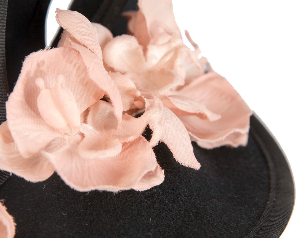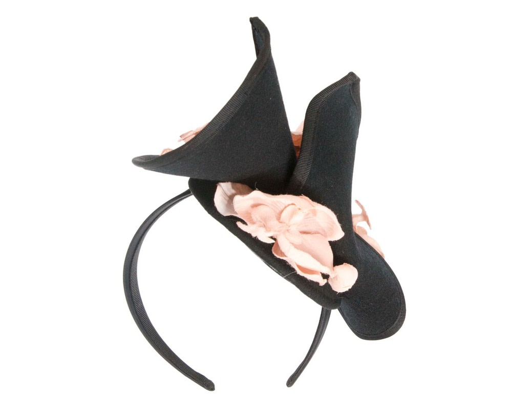 Elevate your style with our exquisite Sculptured Black and Nude Felt Fascinator, meticulously crafted by our skilled milliners in the vibrant heart of Melbourne. This winter racing fascinator boasts a luxurious felt base adorned with contrast orchid flower, elegantly positioned on a headband for effortless wear.