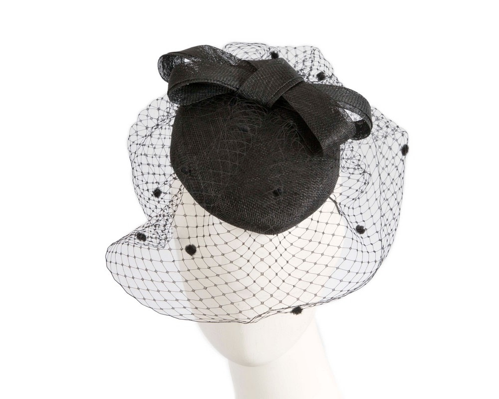 Black pillbox hat with face veil. Sinamay pillbox base decorated with large bow.