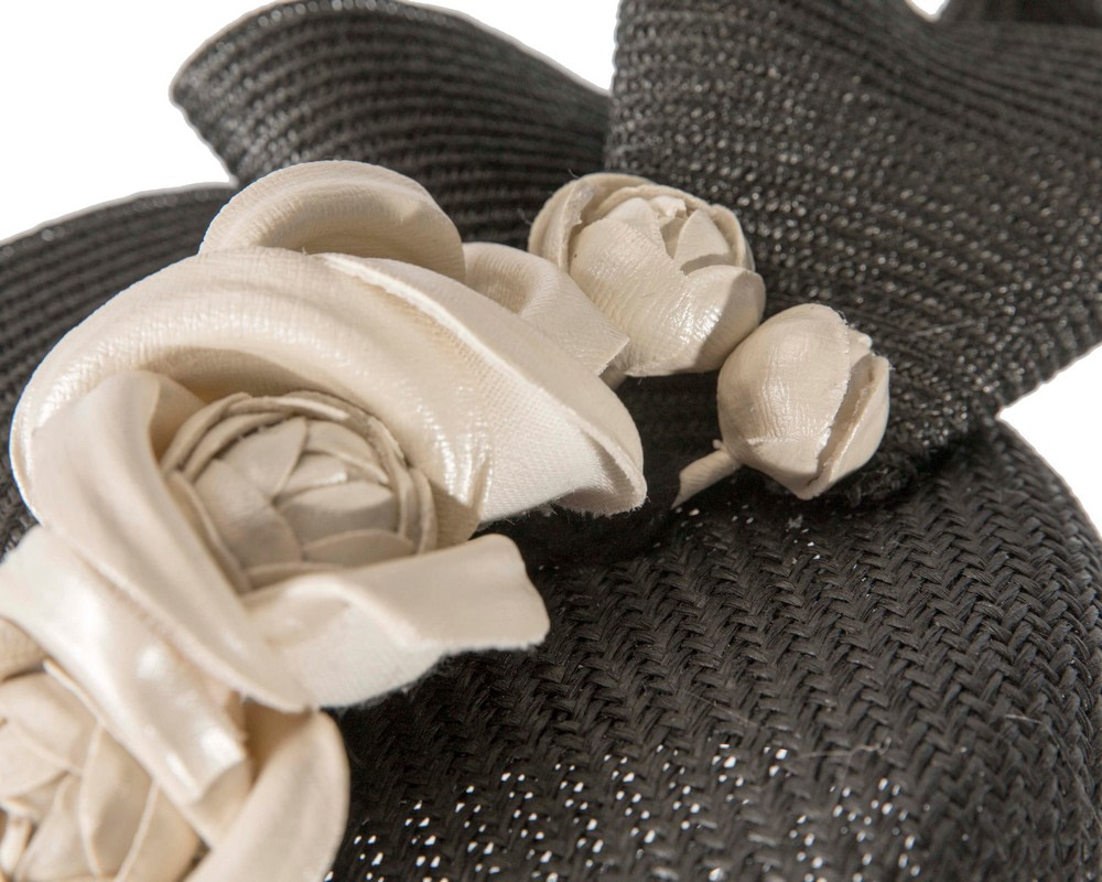 Classic black pillbox base with stylish decoration and contrast cream leather flower arrangement. This fascinator will be a jewel of your next spring racing outfit.