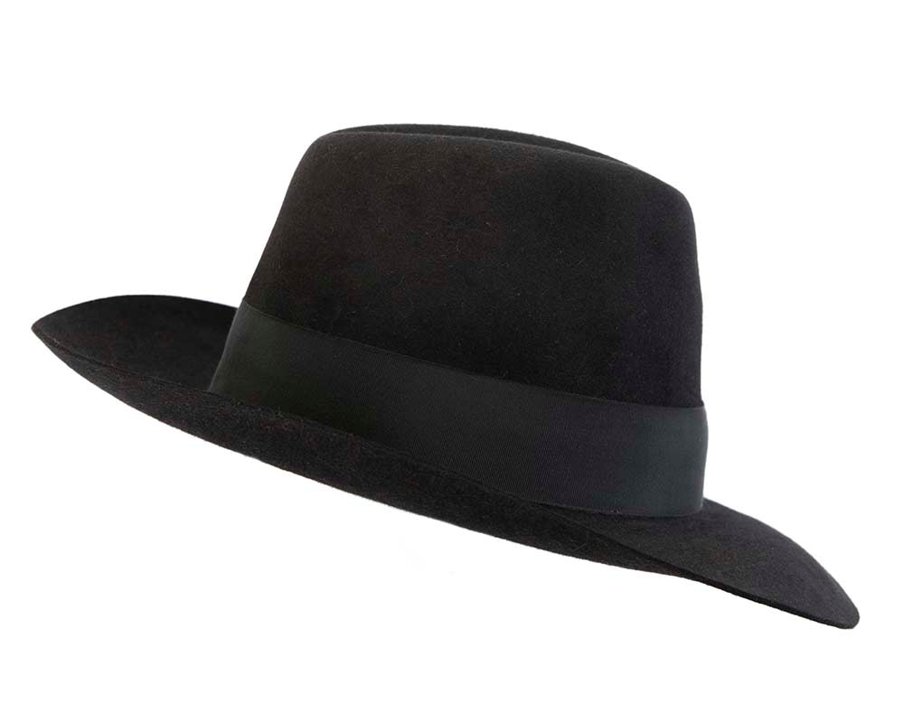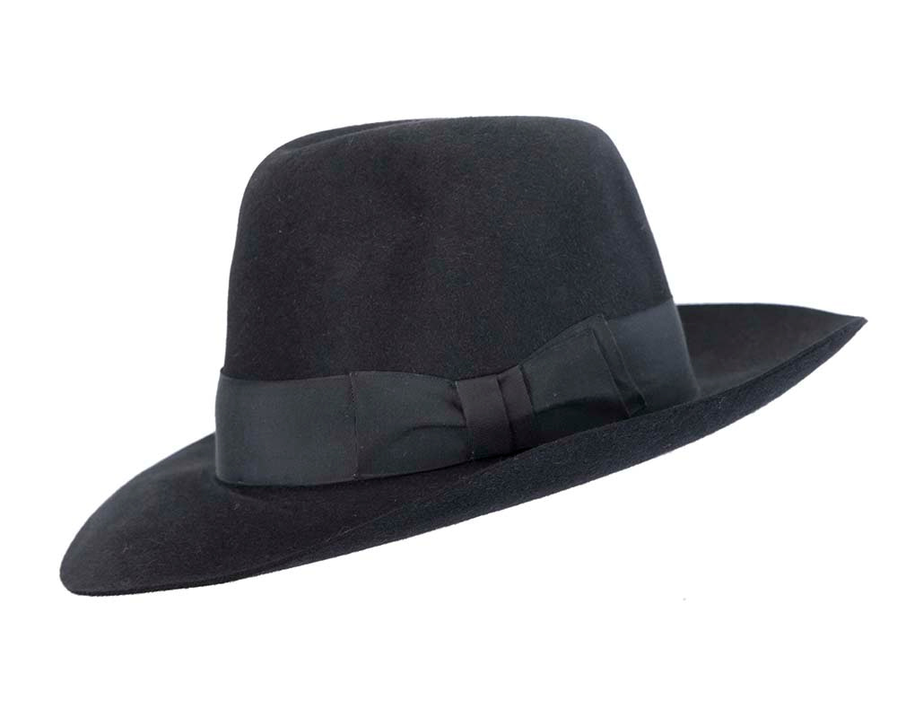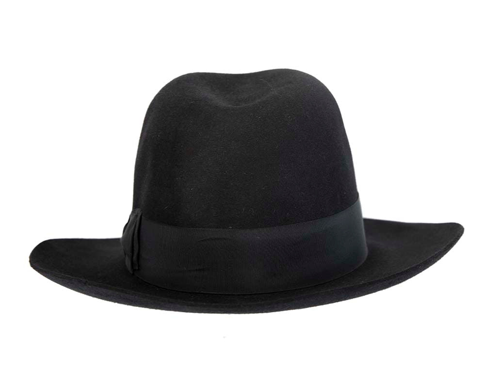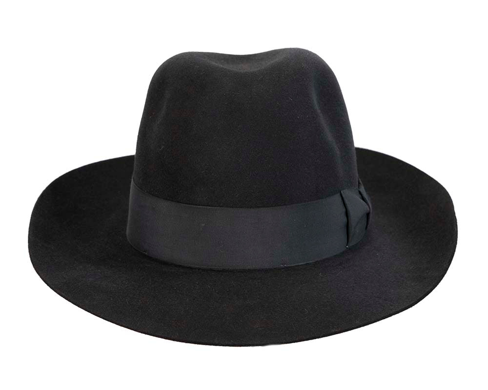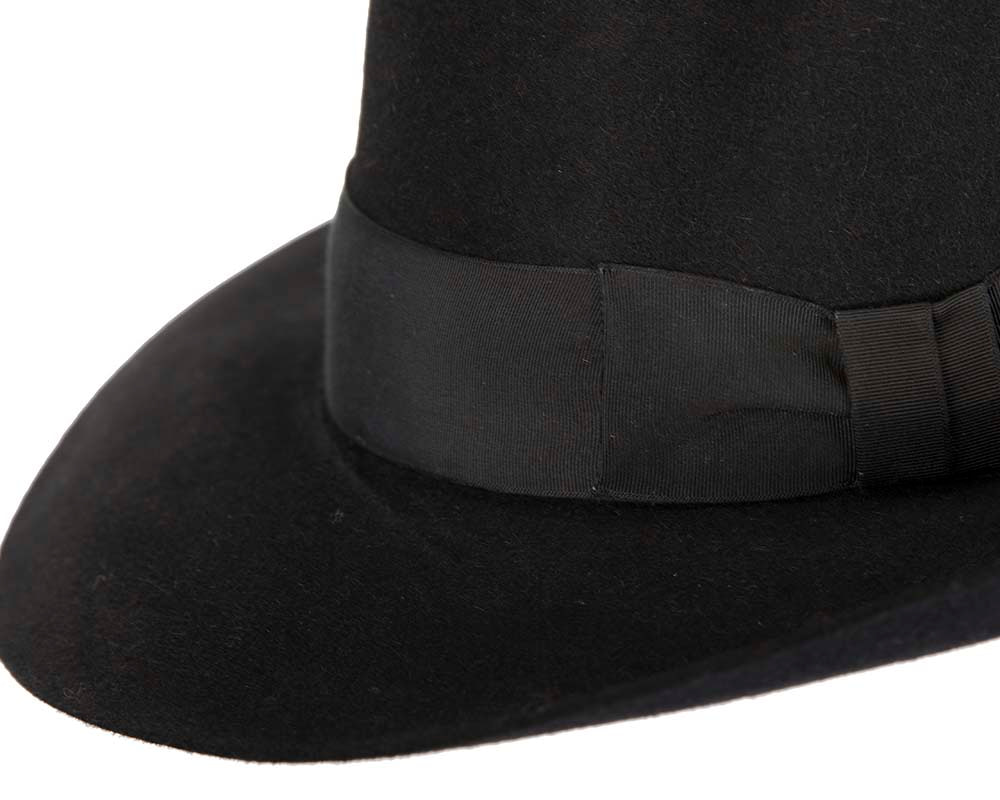 Made in Europe, this black fedora hat is made from pure rabbit fur. Wide brim.