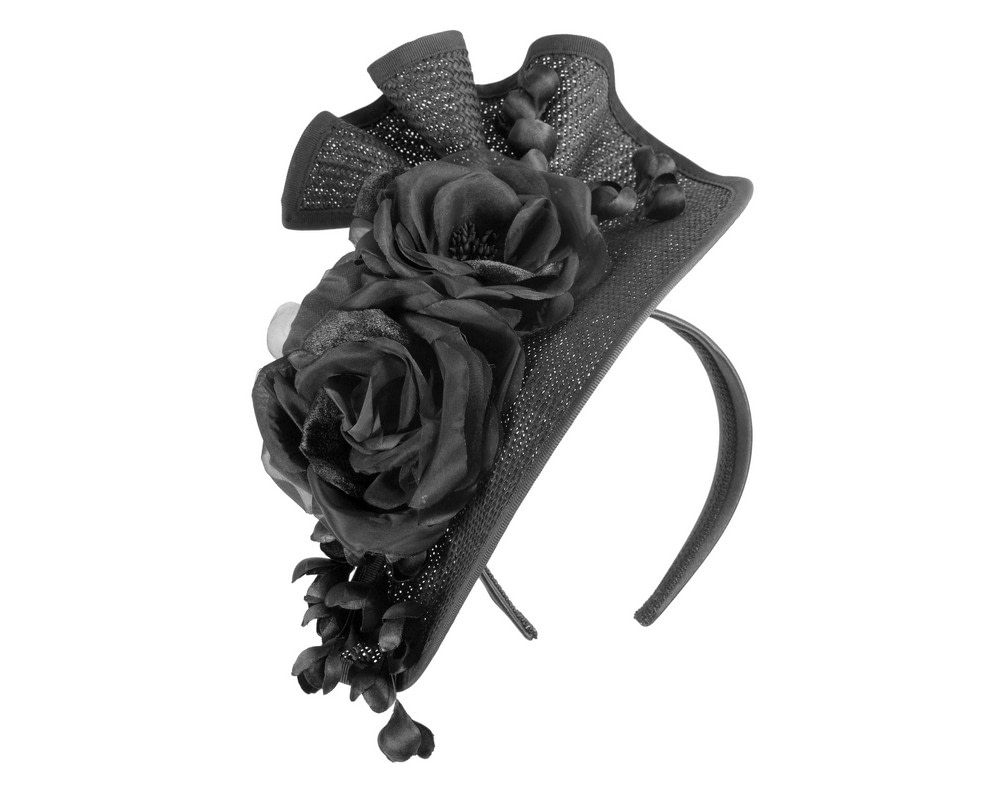 Beautiful black fascinator with matching flower bunch from latest Fillies Collection. Fascinator is placed on the headband. Hand made sculpture and exclusive flower arrangement