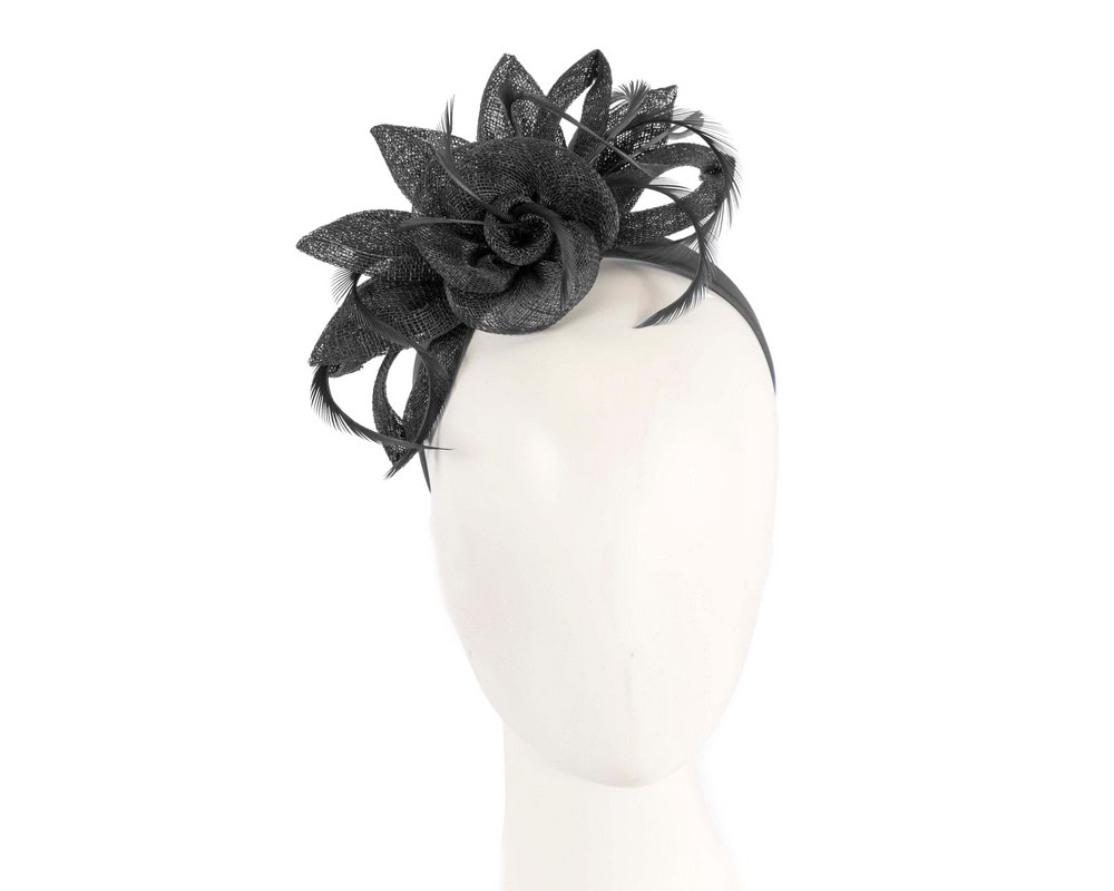 Hand made black sinamay flower with soft feathers. Great choice for any spring racing outfit.