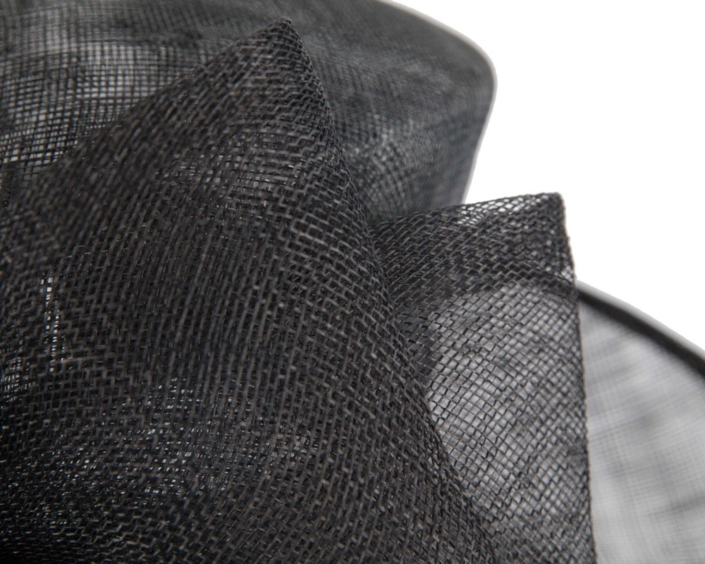 Black, wide brim sinamay fashion hat decorated with large matching bow. Great choice for your next spring racing outfit.