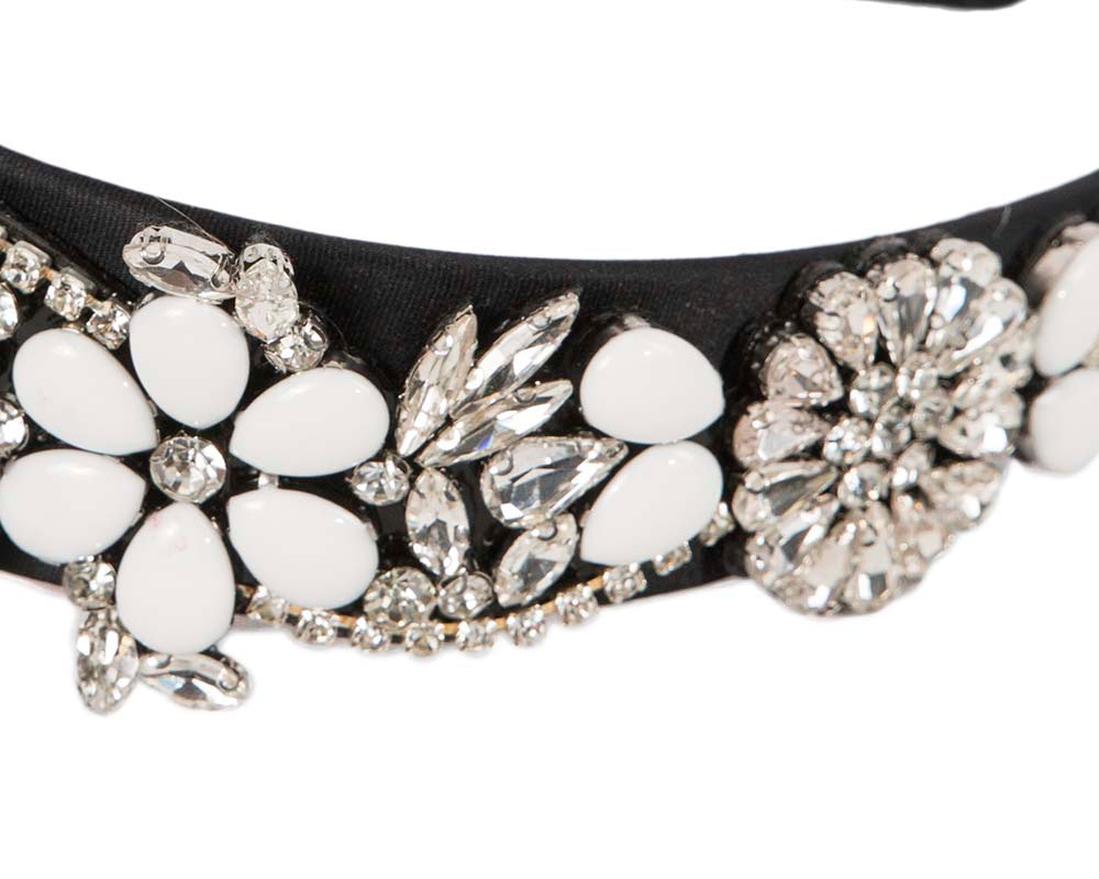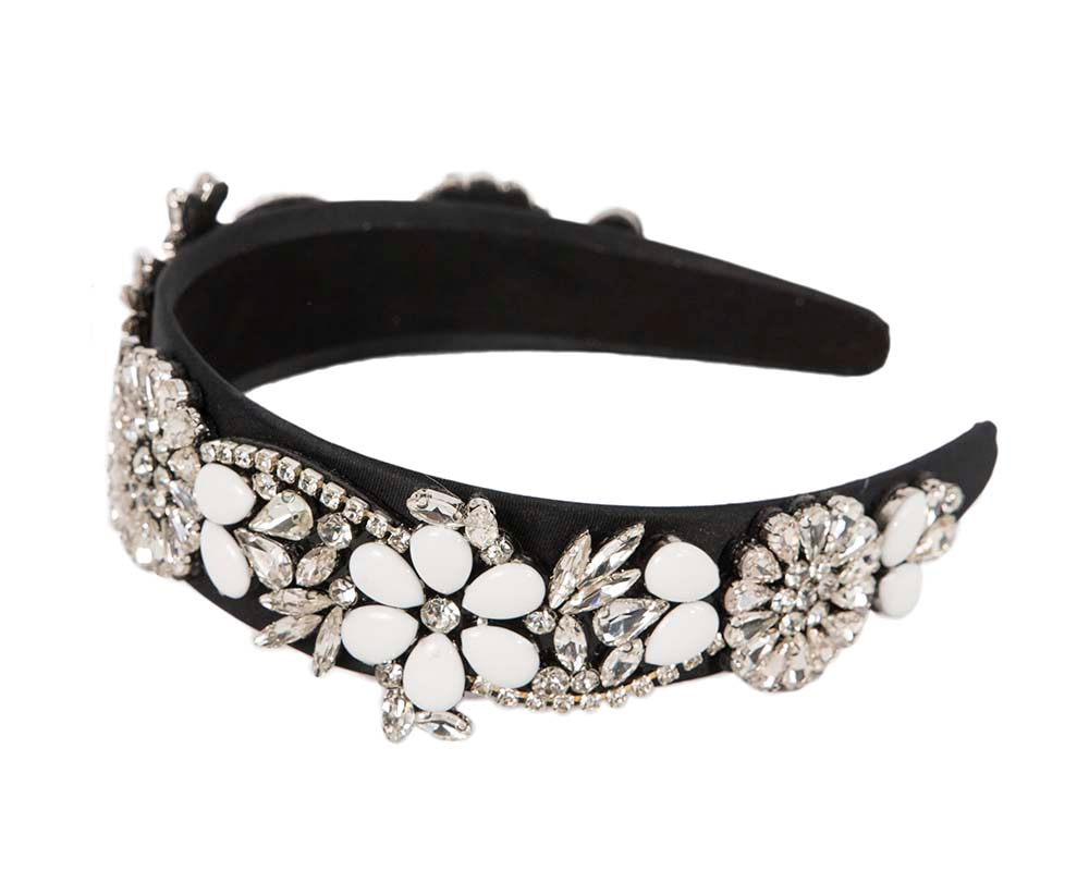 Black and white headband covered in sparkling crystals. Great choice for your next racing outfit.