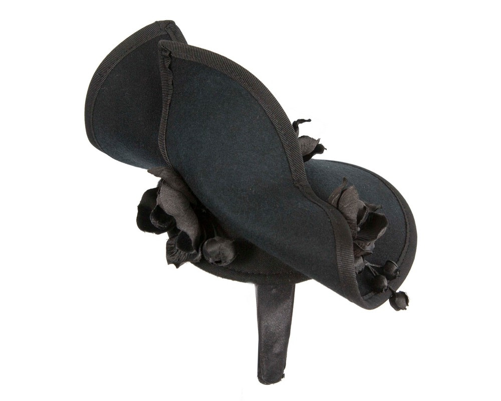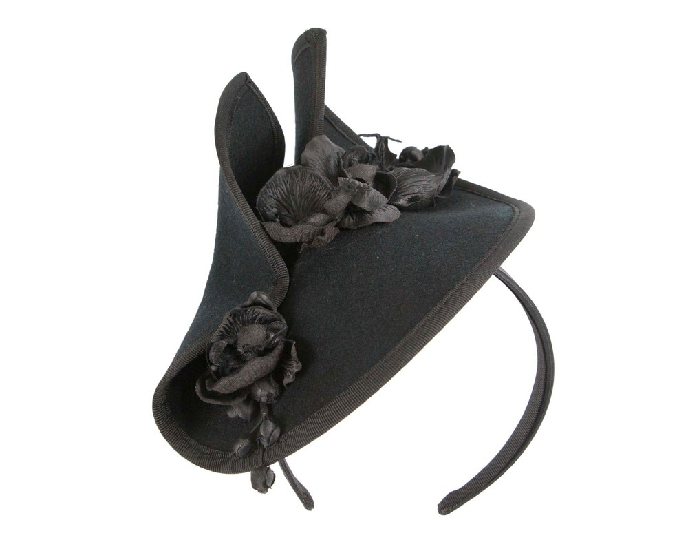 Elevate your style with our exquisite Sculptured Black Felt Fascinator, meticulously crafted by our skilled milliners in the vibrant heart of Melbourne. This winter racing fascinator boasts a luxurious felt base adorned with a perfectly matched orchid flower, elegantly positioned on a headband for effortless wear.