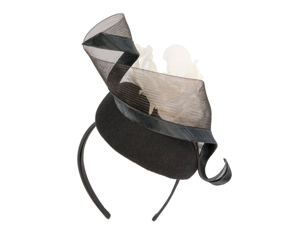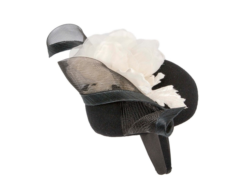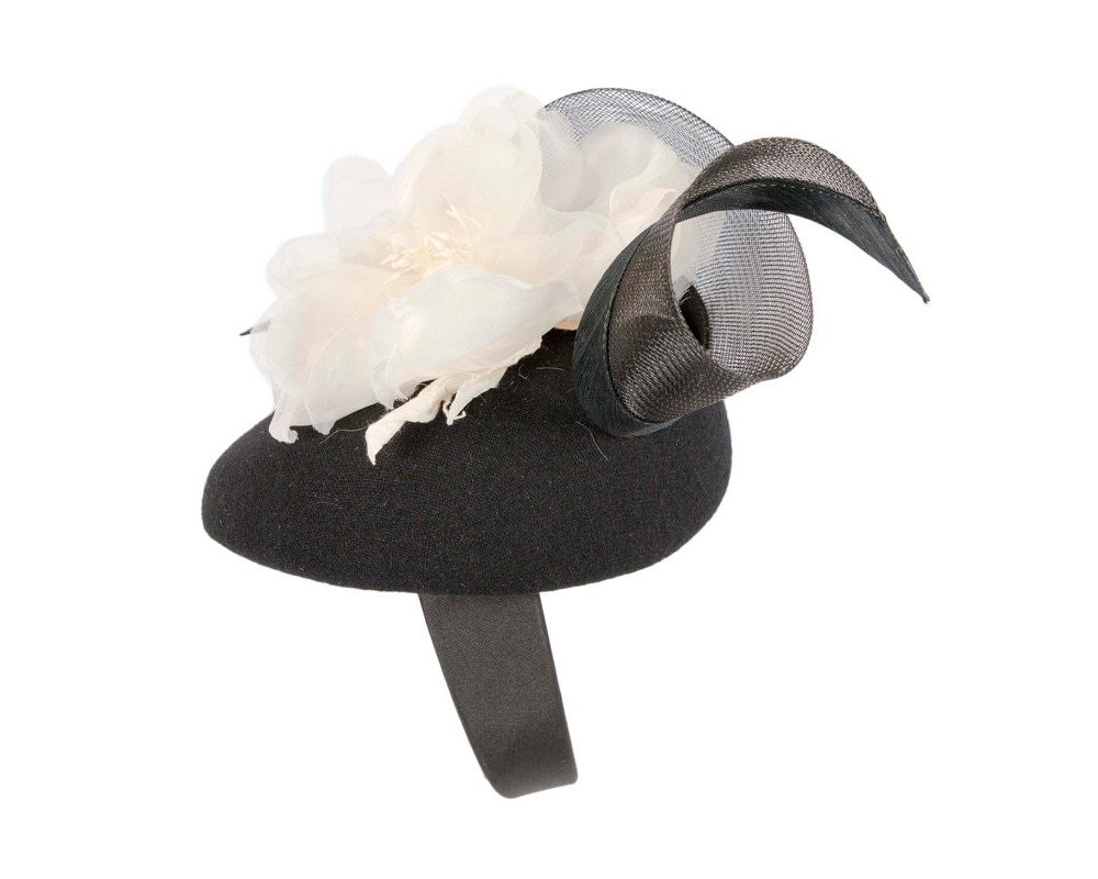 Created in the heart of Melbourne, this black winter racing fascinator sports small woolen pillbox decorated with hand-made wave and large contrast cream silk flower.