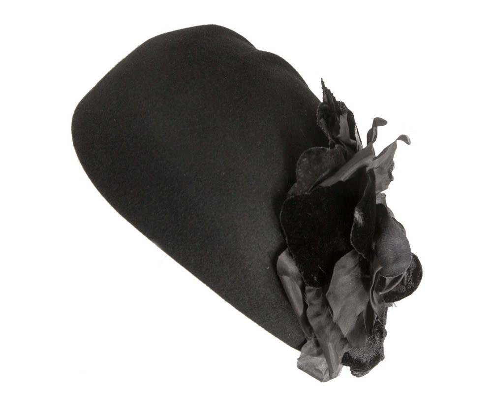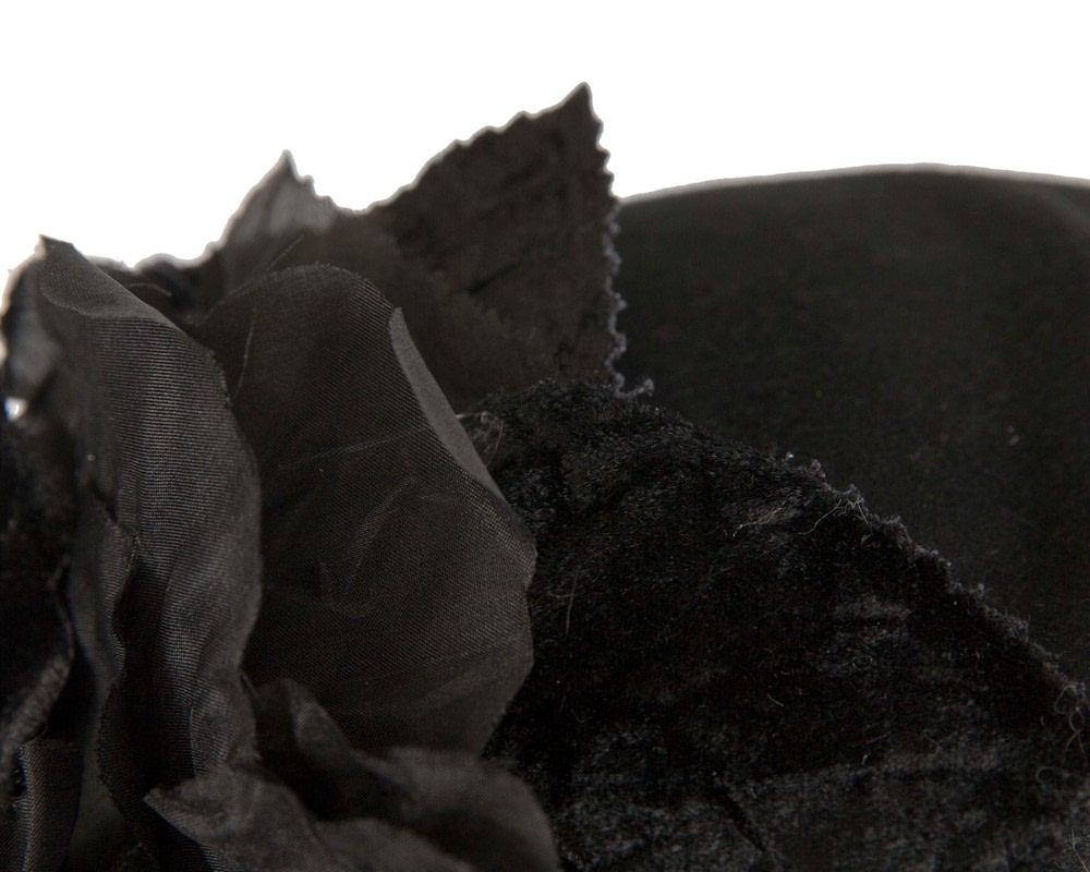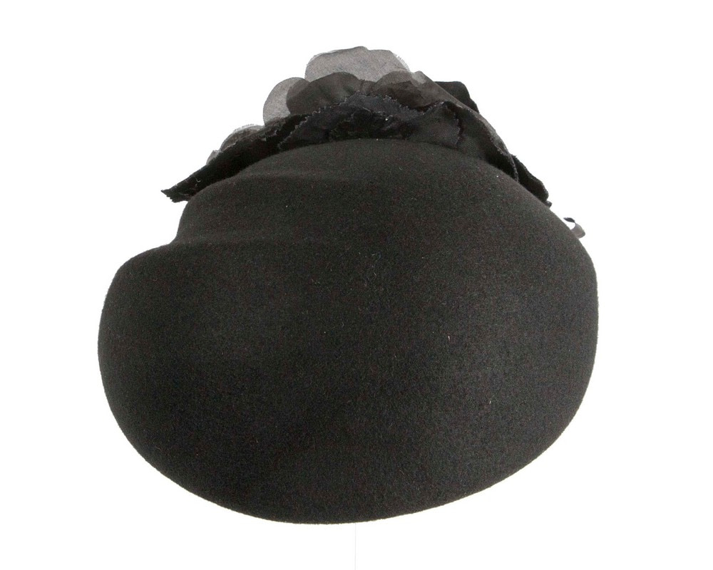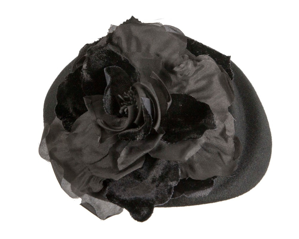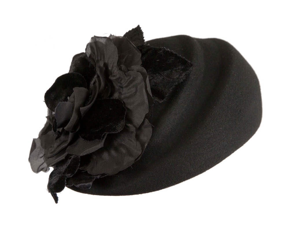 Beautiful black felt fashion beret hat decorated with large matching silk flower arrangement. Created in Melbourne by Fillies Collection, this hat will be a great addition to your winter racing or elegant everyday outfit.