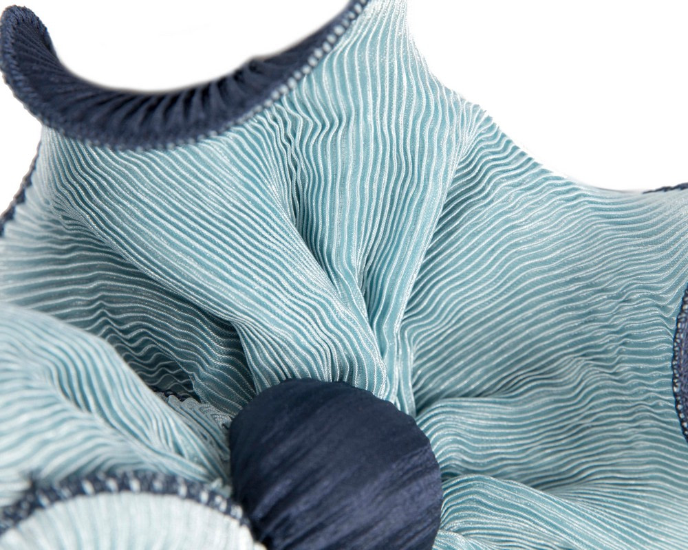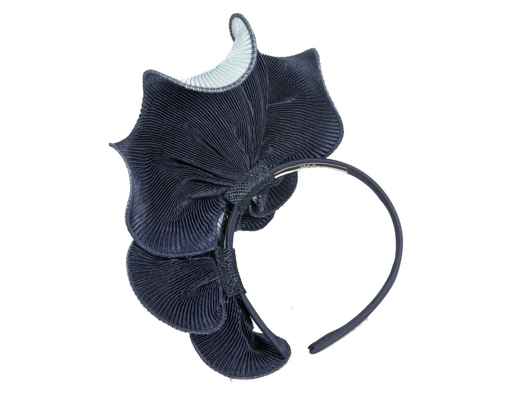 Beautiful hand-made blue flowers with navy backing and center. This elegant fascinator is expertly made from pleated satin and it will be a fantastic addition to your next racing outfit.