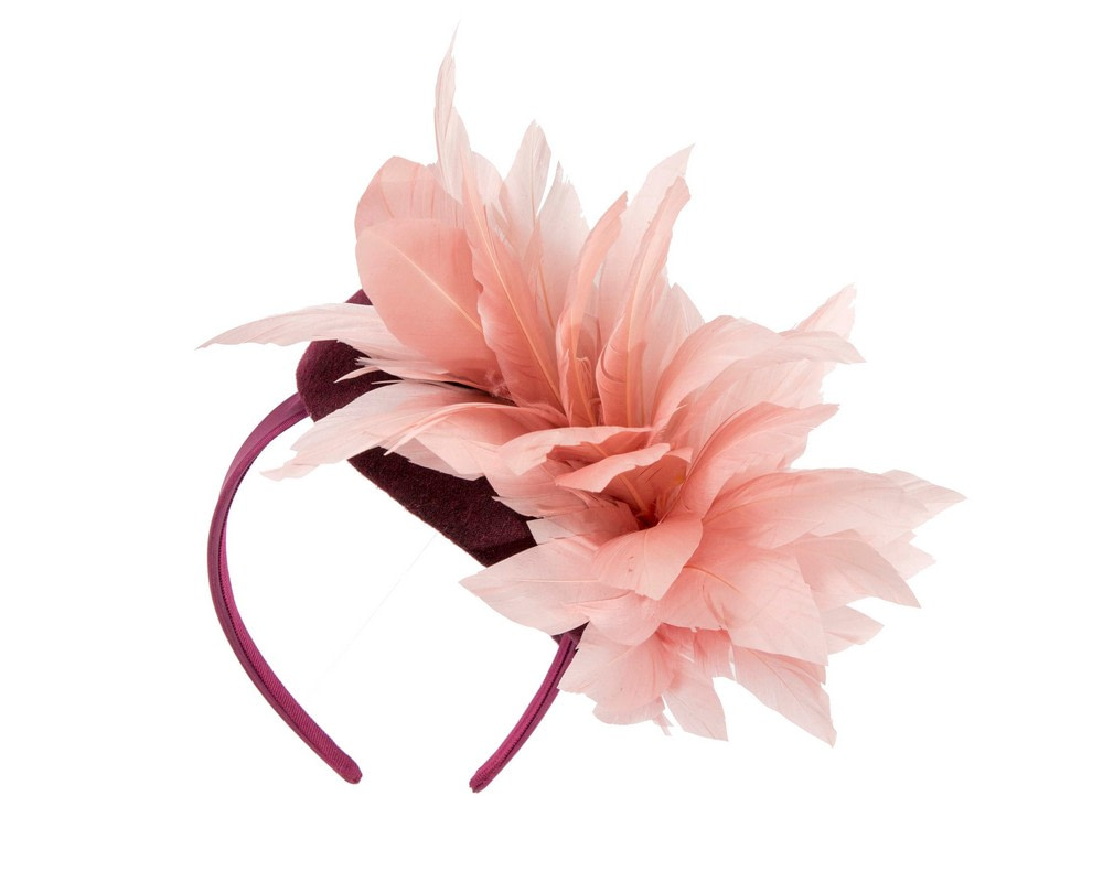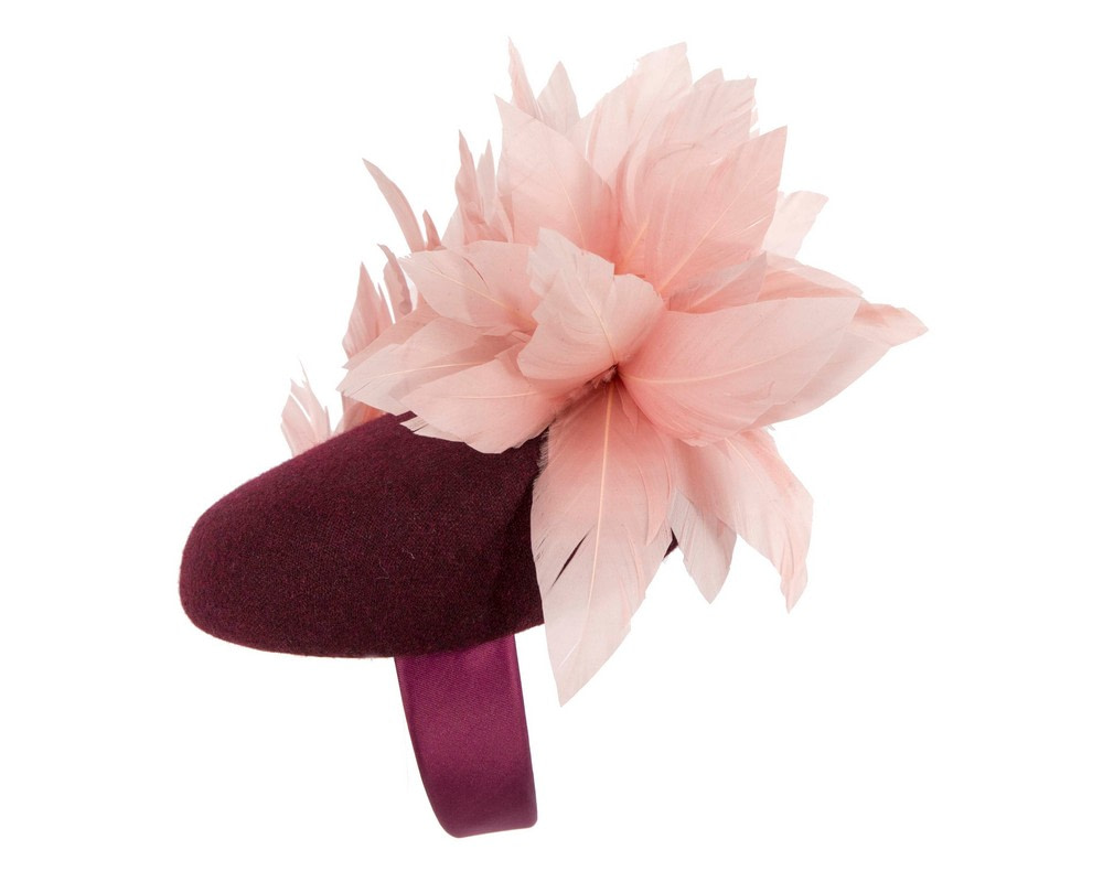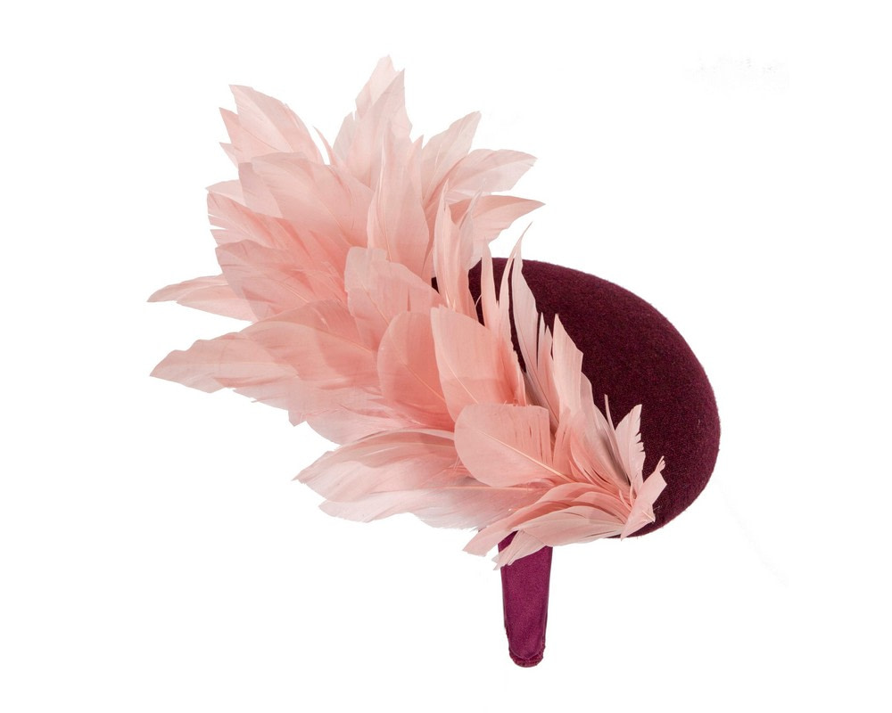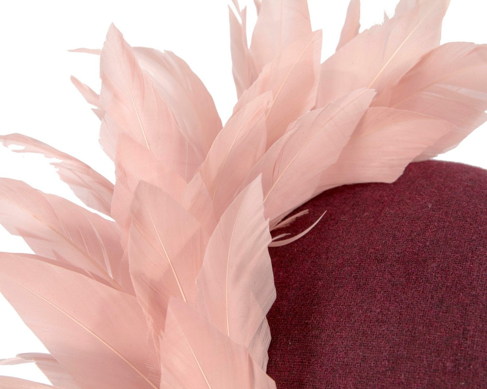 Burgundy wine woolen pillbox fascinator decorated with rich dusty pink feather cocktail. Perfect choice for your next autumn or winter racing outfit.