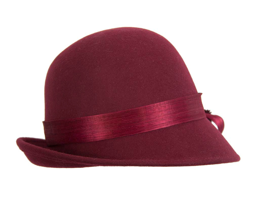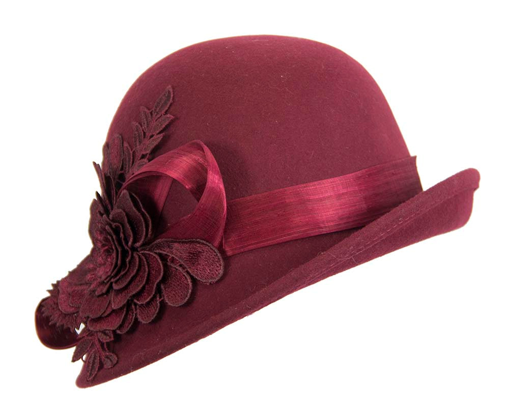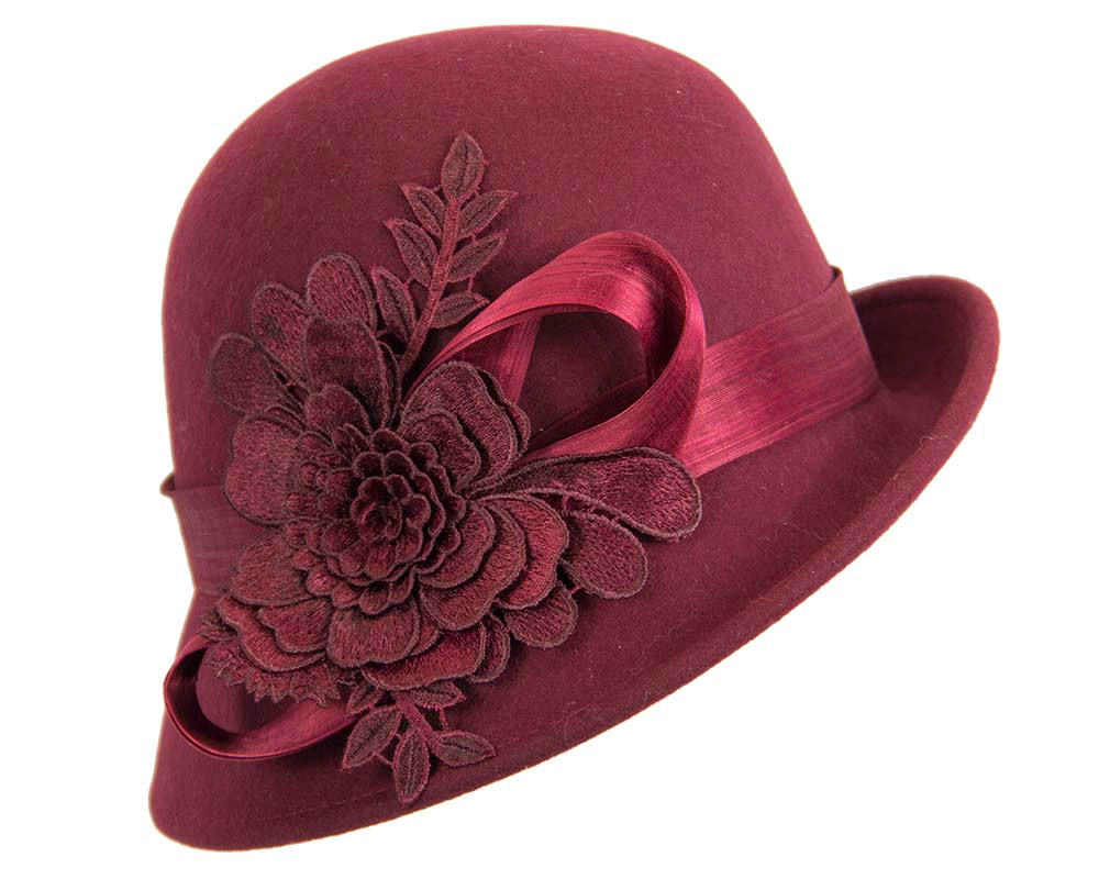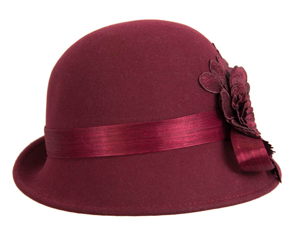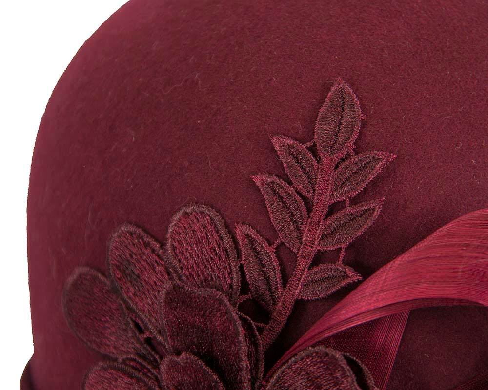 Burgundy wine felt cloche hat with lace by Fillies Collection