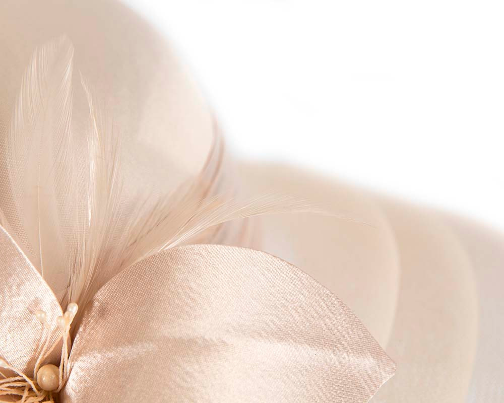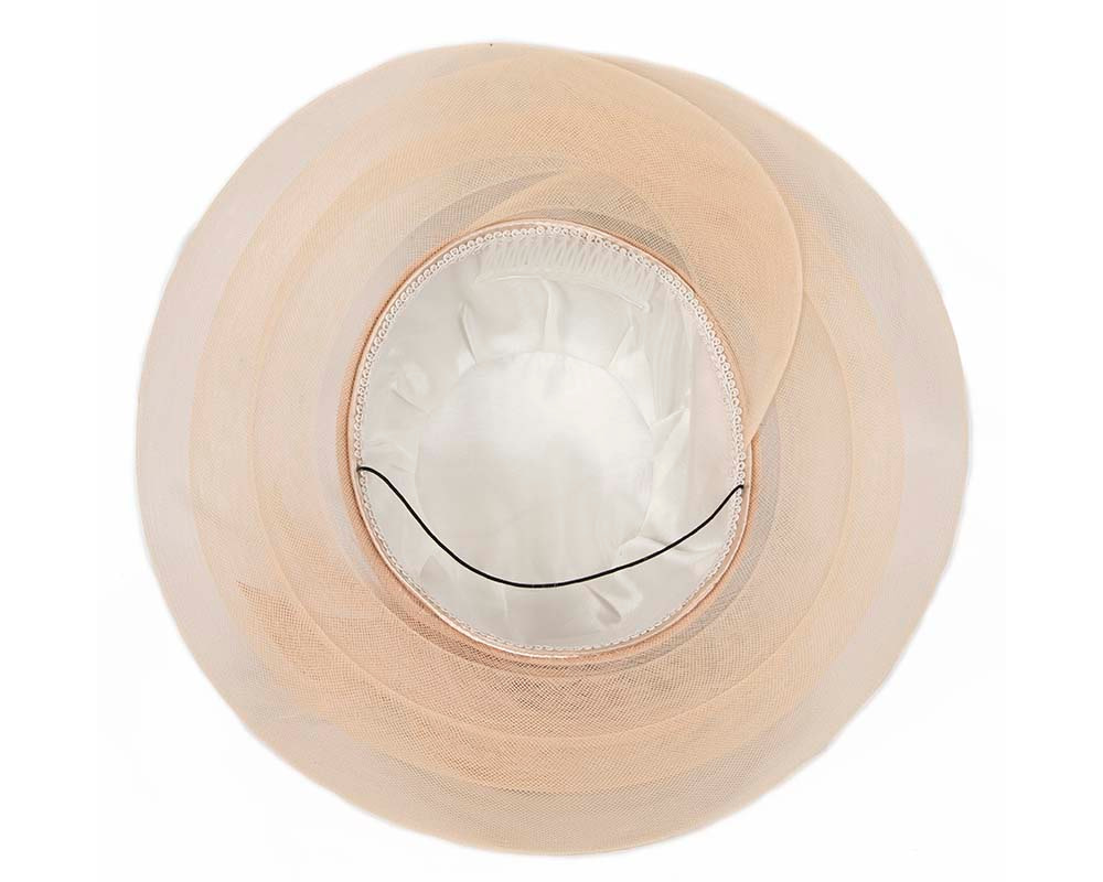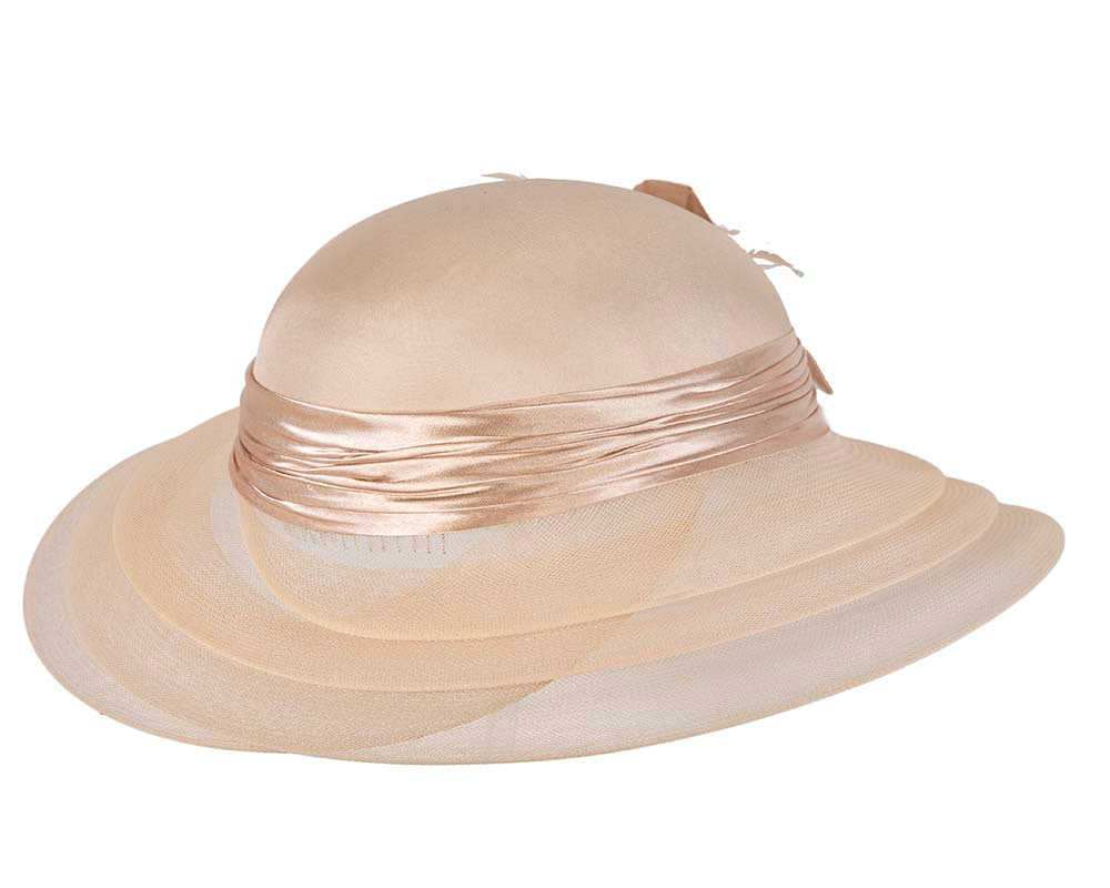 This stunning hat from our beautiful range of mother of the bride, evening, church and special occasion hats is hand made from luxurious fabric with crinoline brim and elegant trim. Hat is fully lined and has comb for comfortable wearing. This designer fashion hat is made to order and we can make it in many colours.