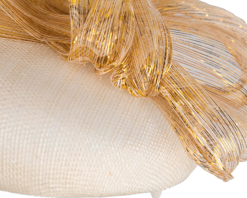 Cream pillbox fascinator with gold silk abaca bow by Fillies Collection