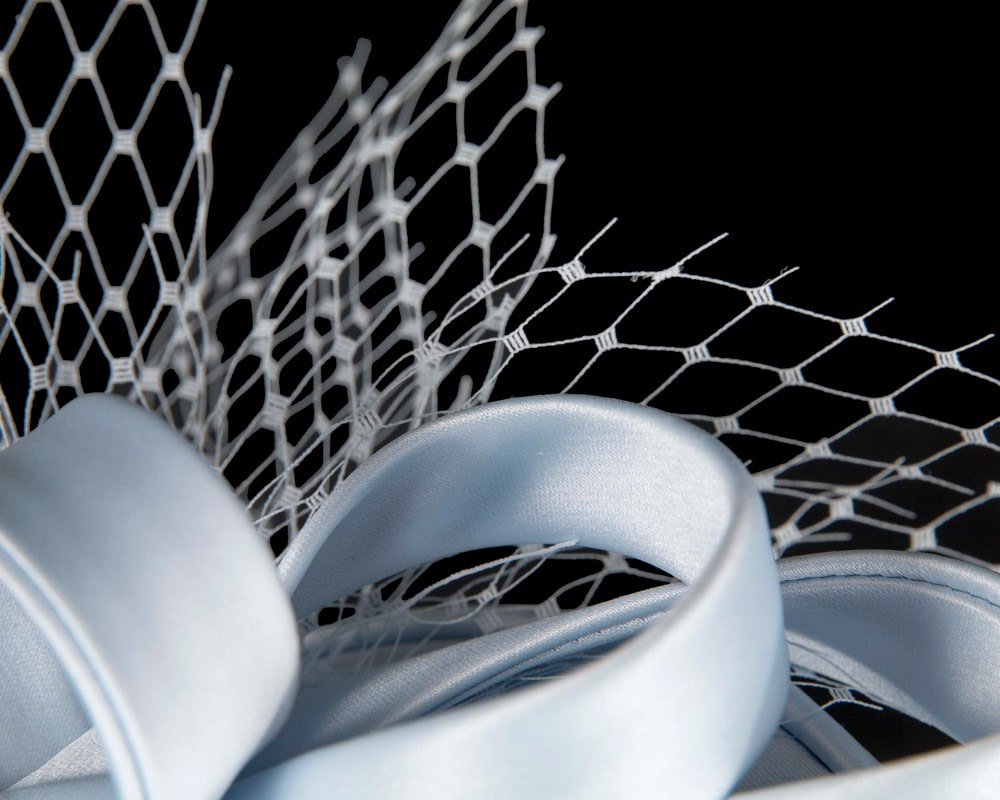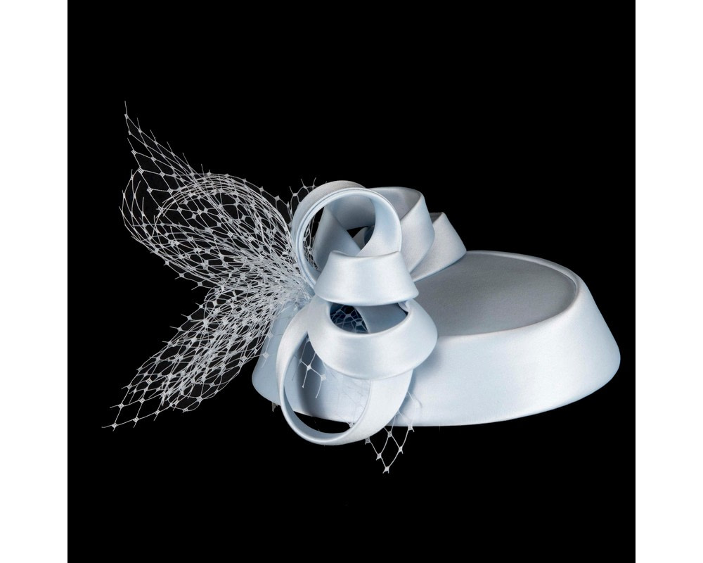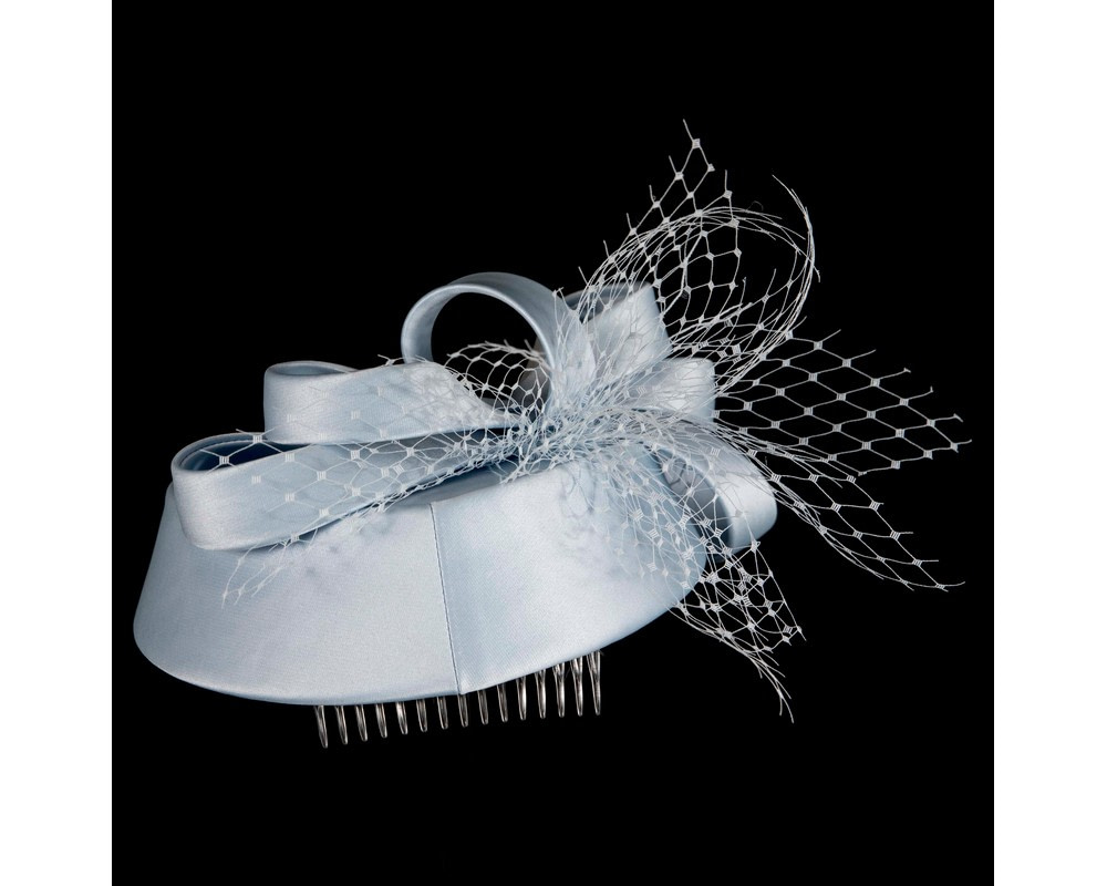 Beautiful light blue pillbox hat with elegant loops from our beautiful range of cocktail and wedding hats. This stunning pillbox is custom made to order from luxurious fabric and we can make it in many colors, making it a perfect choice for cocktail parties, races or mother of the bride outfit.