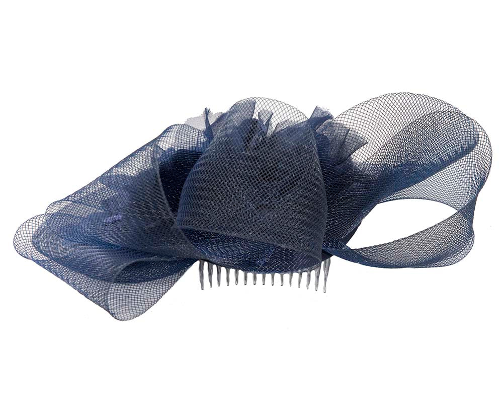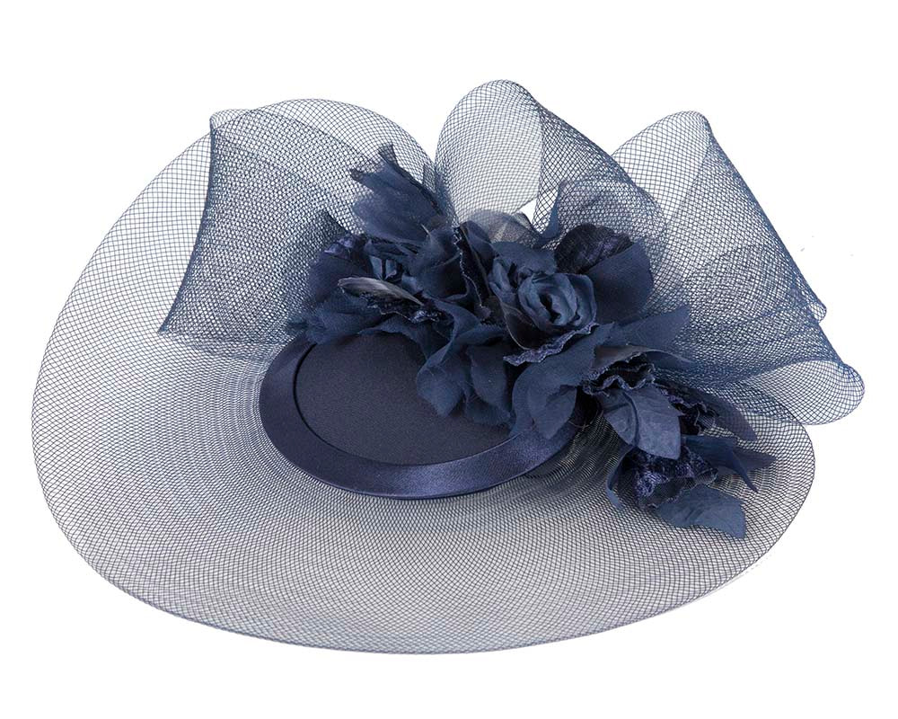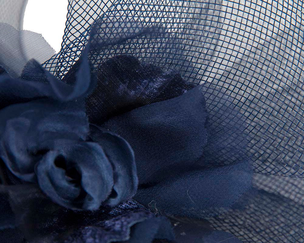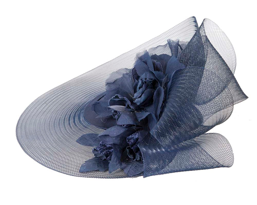This elegant navy cocktail hat is hand made in Australia from luxurious fabric with large tonal flower bunch. It is an excellent choice for any racing carnivals or special occasion, such as weddings.