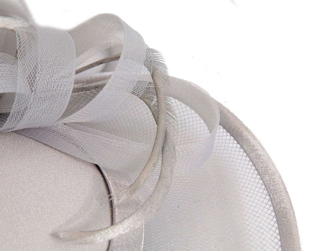 This fancy silver cocktail hat from our beautiful range of cocktail hats, headpieces and special occasion hats is custom made from luxurious fabric with crinoline and comb for comfortable wearing. An ideal choice for weddings, Ascot, Kentucky Derby or Melbourne Cup outfit.