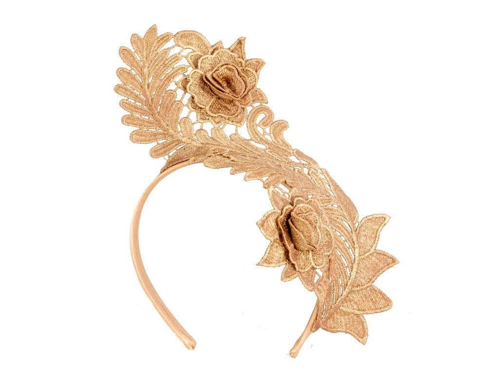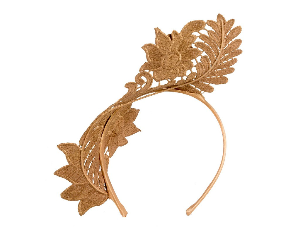 Gold lace fascinator on the headband. Delicate hand-sculptured lace leaf mounted on a comfortable headband. This Max Alexander fascinator will be a great addition to your next racing outfit.