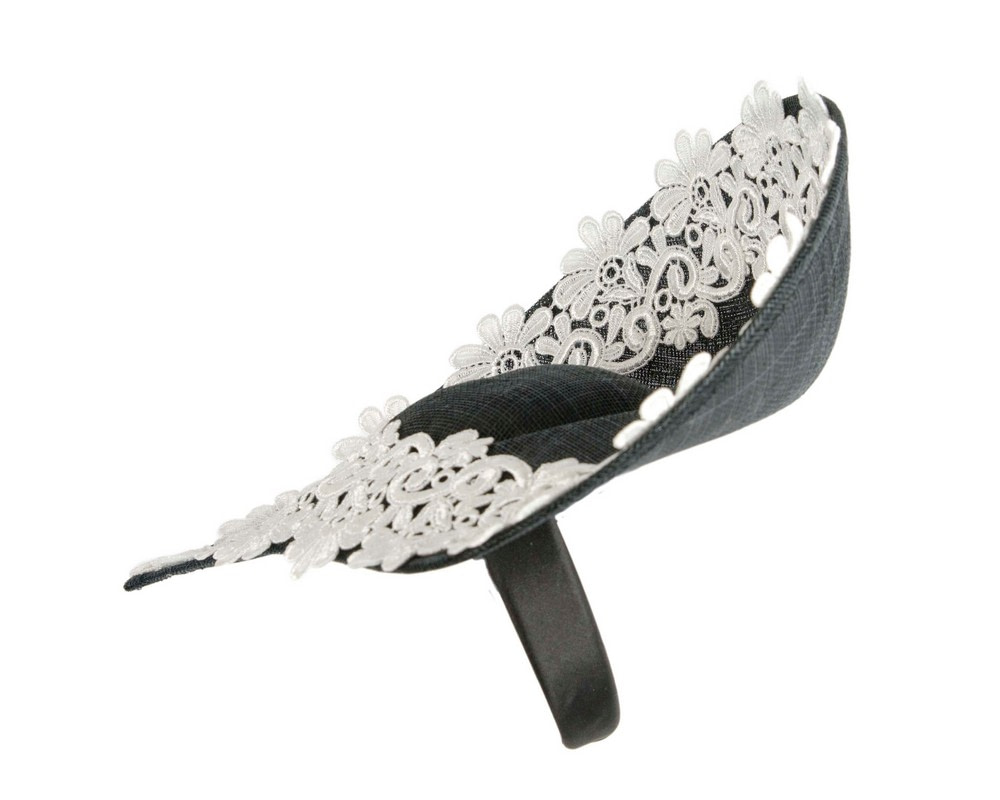 Turn heads with this stunning black spring racing fascinator. Curvy asymmetric sinamay black base decorated with contrast white floral embroidery.