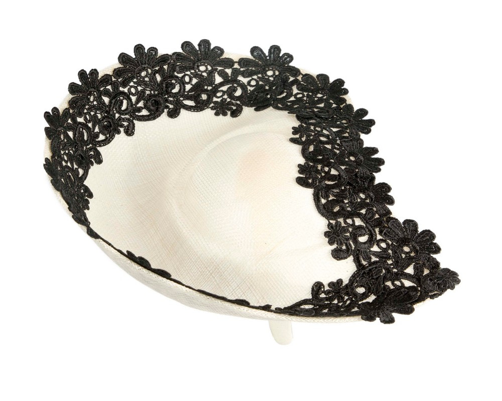 Turn heads with this stunning cream spring racing fascinator. Curvy asymmetric sinamay cream base decorated with contrast black floral embroidery.