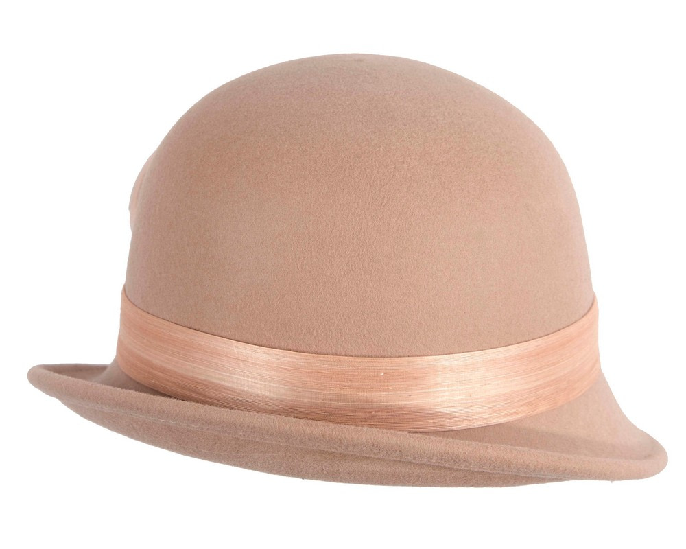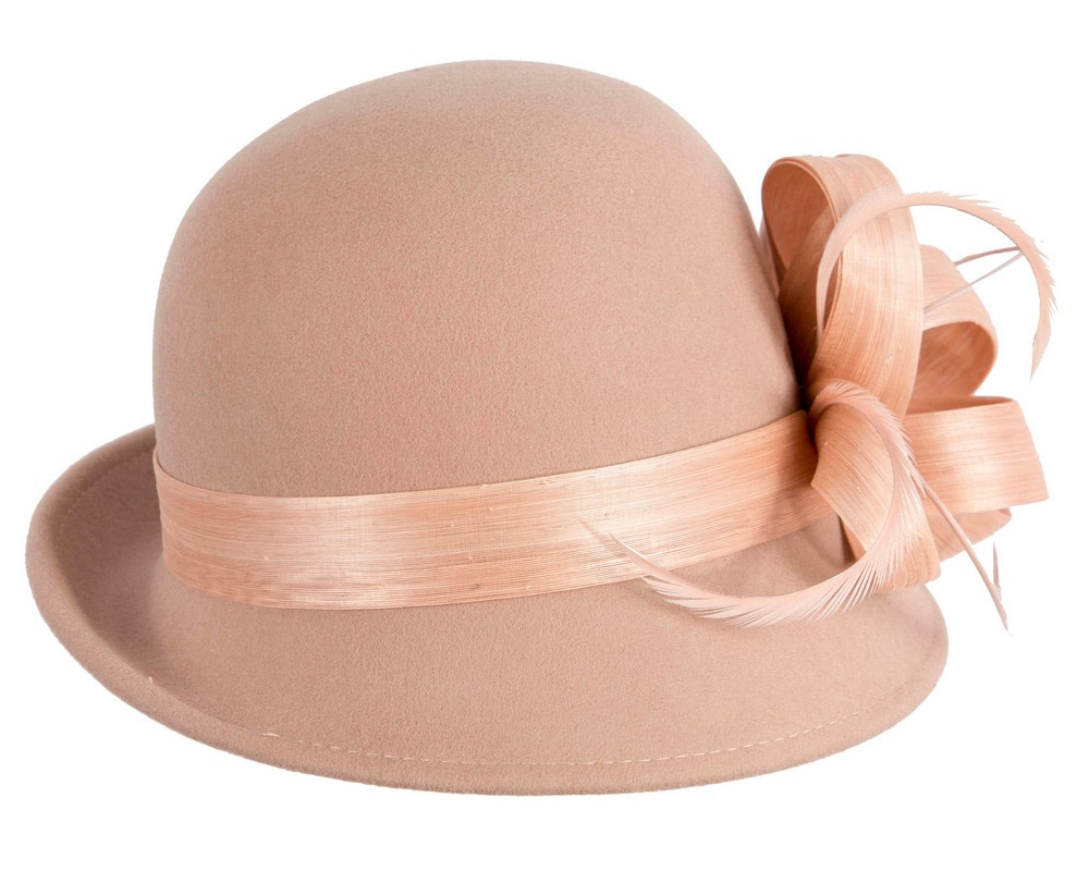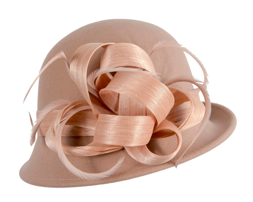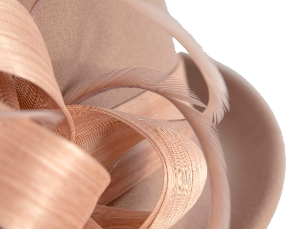 Exclusive camel beige felt winter fashion hat from latest Fillies Collection. Elegant shape decorated with silk abaca loops and feathers. Perfect for everyday wear or winter race events.