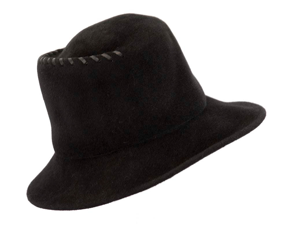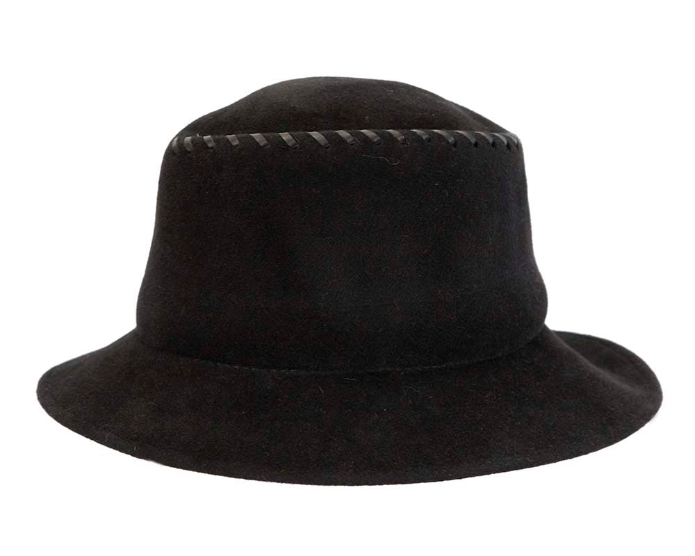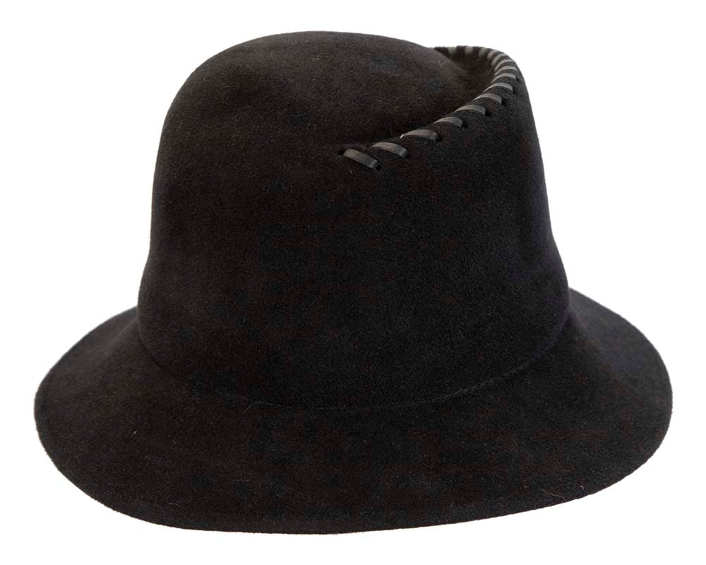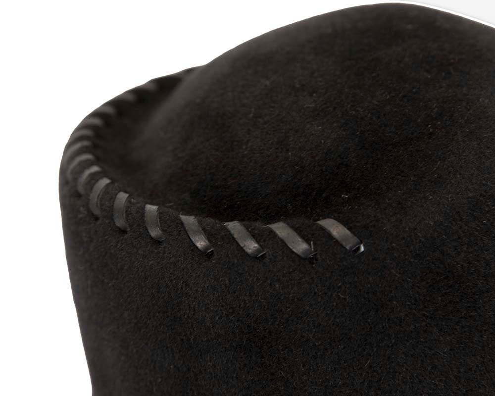 This black hat is made from pure rabbit fur and dressed with leather trim.