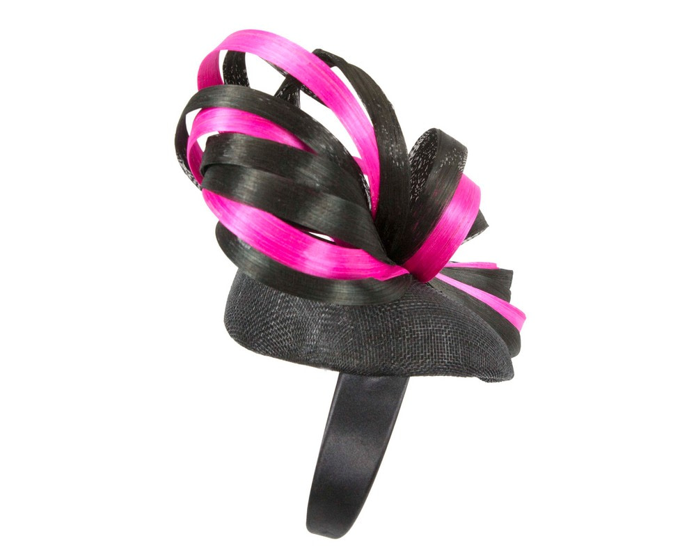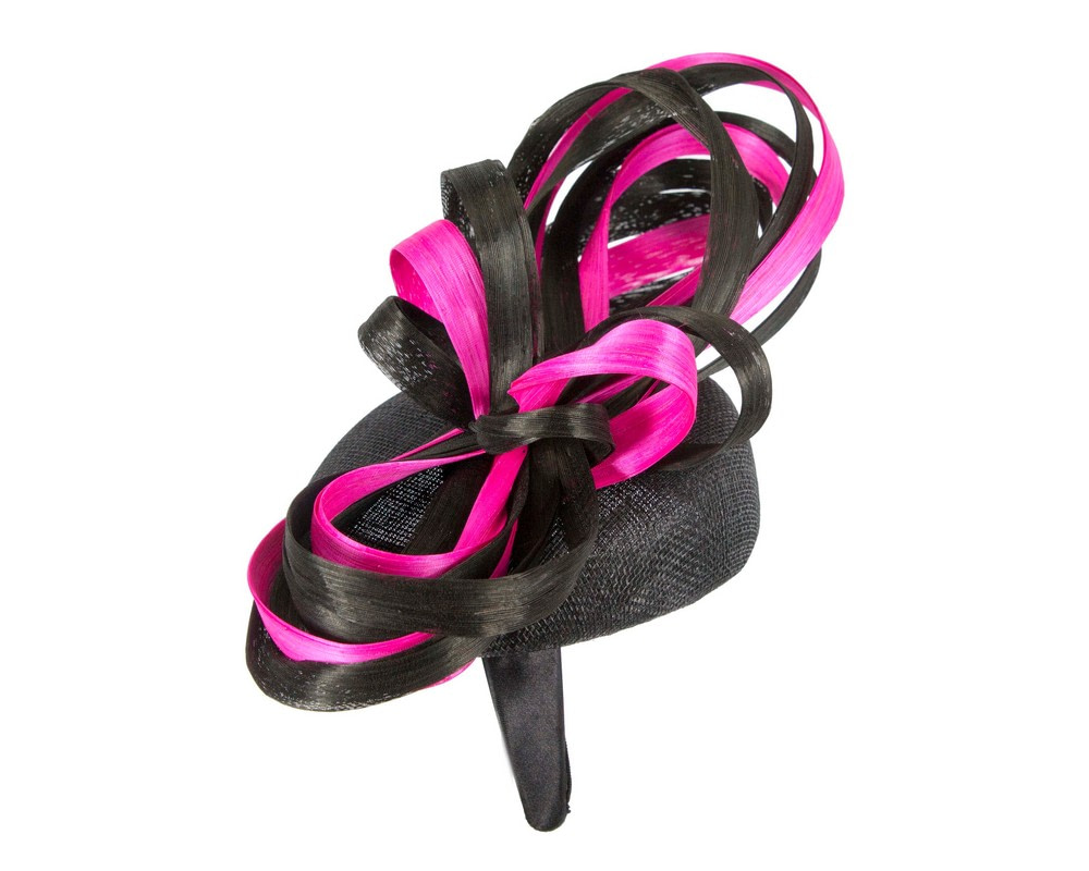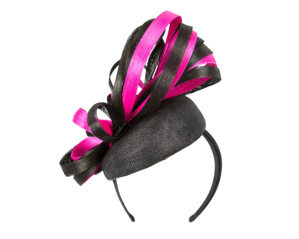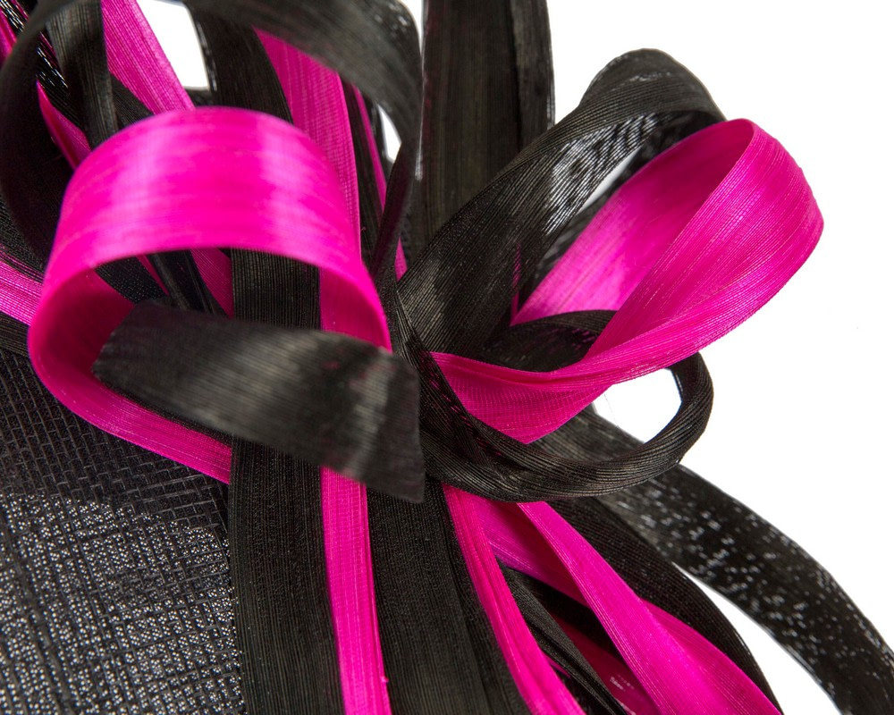 Exclusive black sinamay pillbox decorated with combination of black and fuchsia silk abaca loops. Great choice for your next spring racing outfit.
