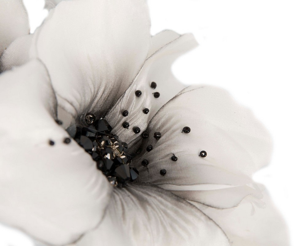 Elegant multi-tone ivory and black flowers created petal by petal with addition of crystals and placed on the headband.