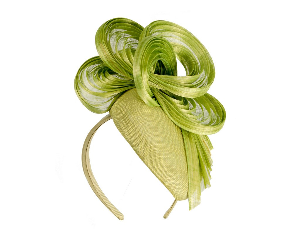 Exclusive creation from Fillies Collection milliners. Lime green sinamay pillbox base decorated with pleated loops of real silk abaca. This fascinator will be a jewel of your next spring racing ensemble.