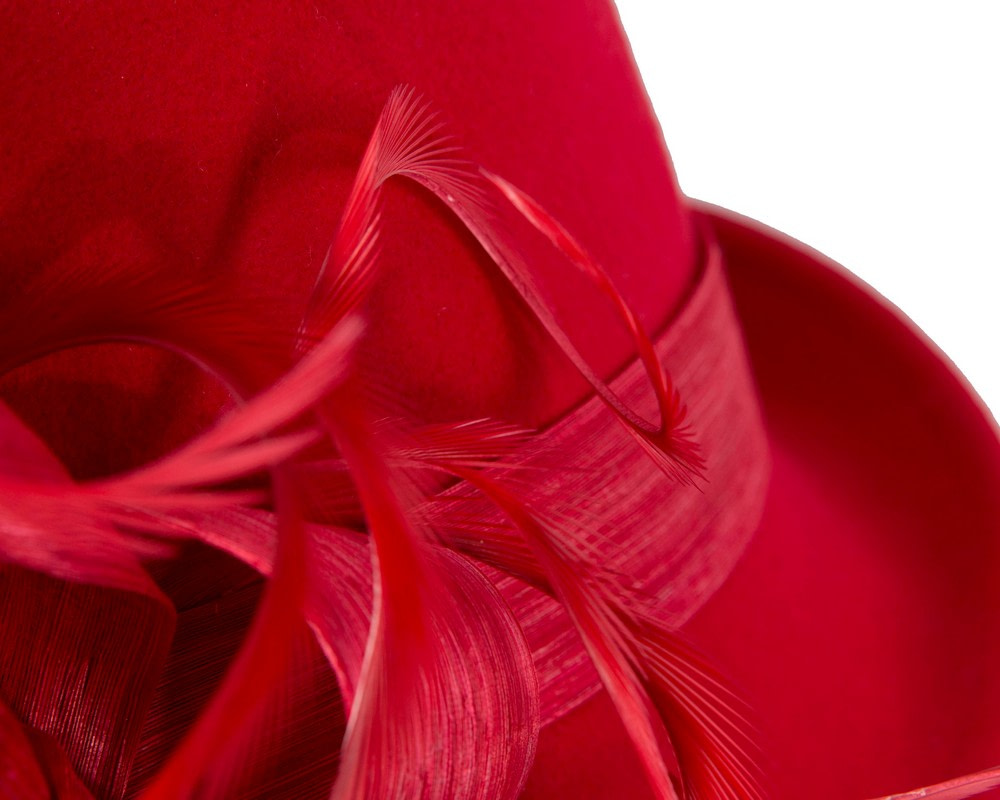 Exclusive red felt winter fashion hat from latest Fillies Collection. Elegant shape decorated with silk abaca loops and feathers. Perfect for everyday wear or winter race events.