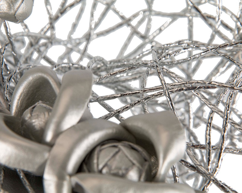 Exclusive silver pillbox fascinator by Cupids Millinery. One-off creation featuring pillbox base decorated with stylish mesh of gold web and topped with matching leather flower.