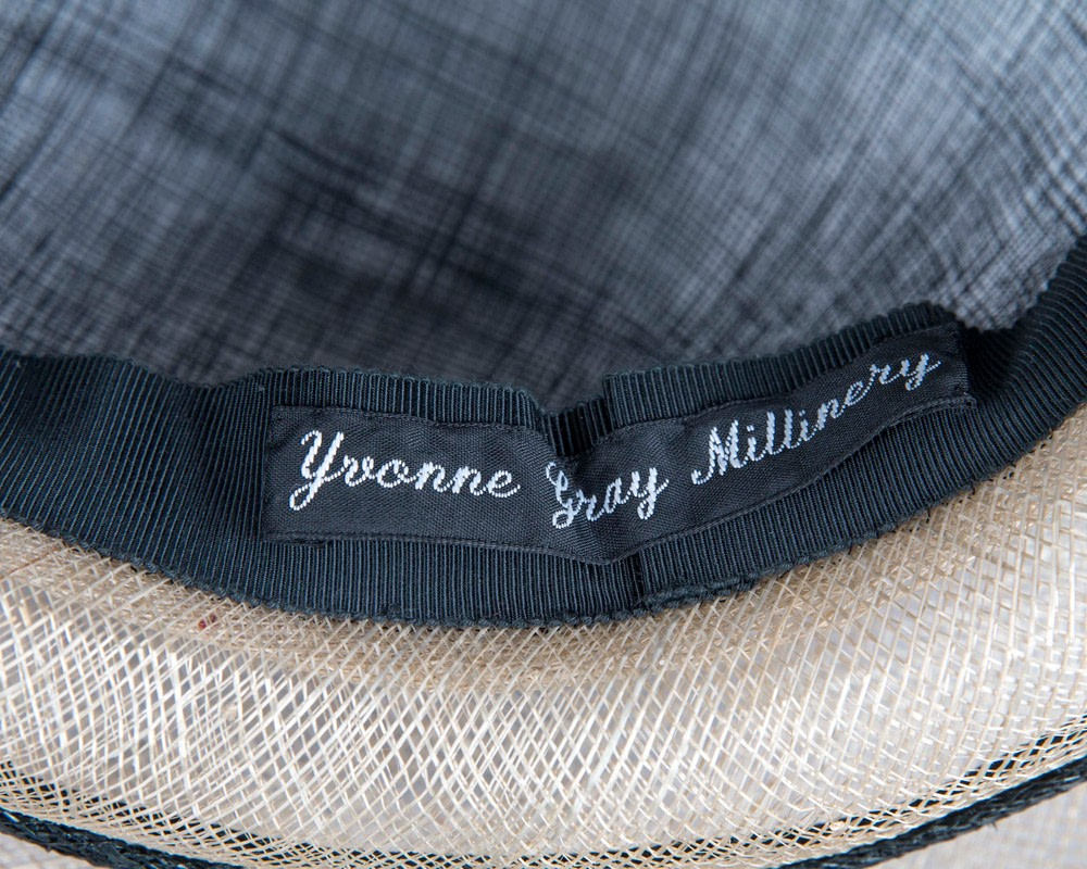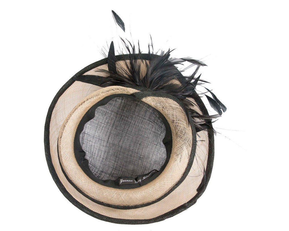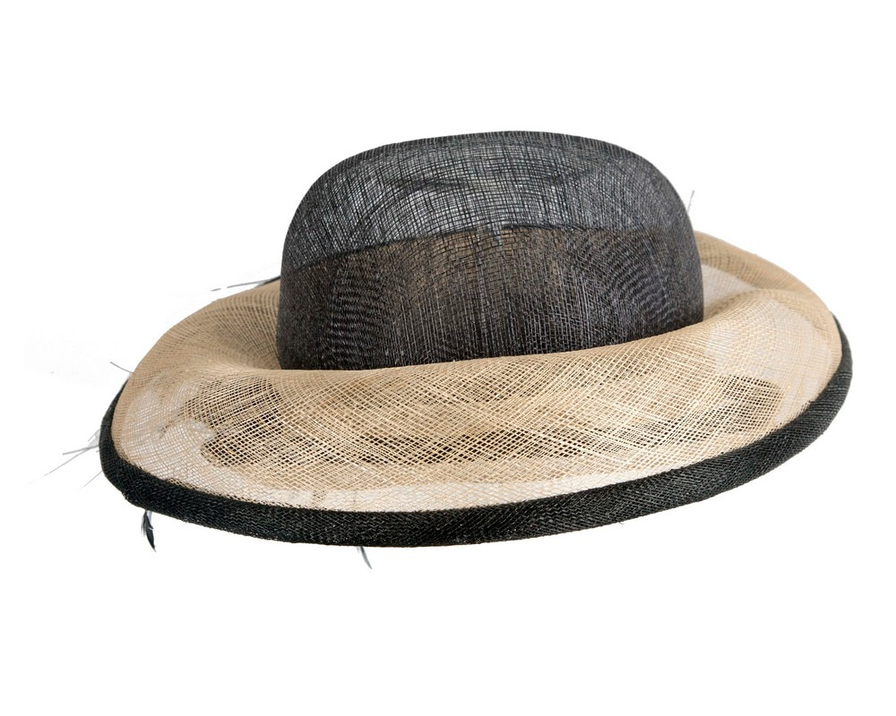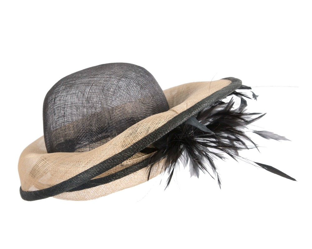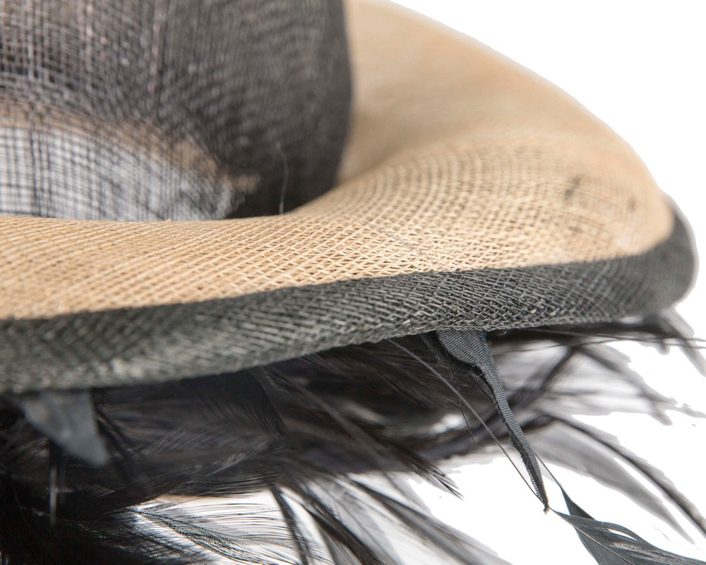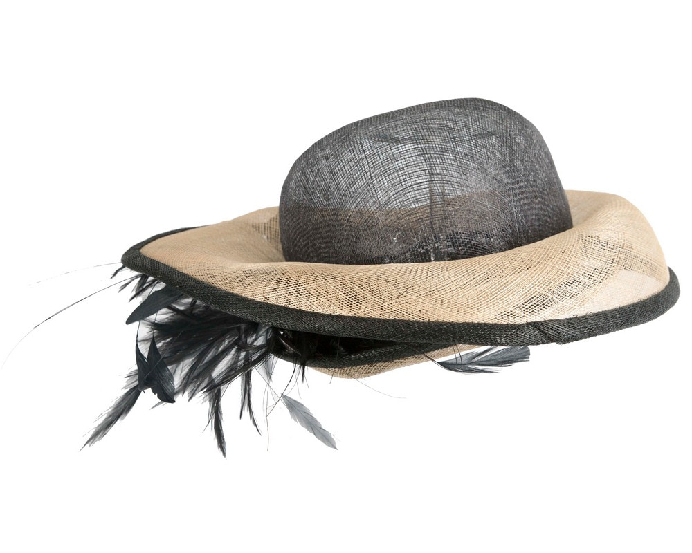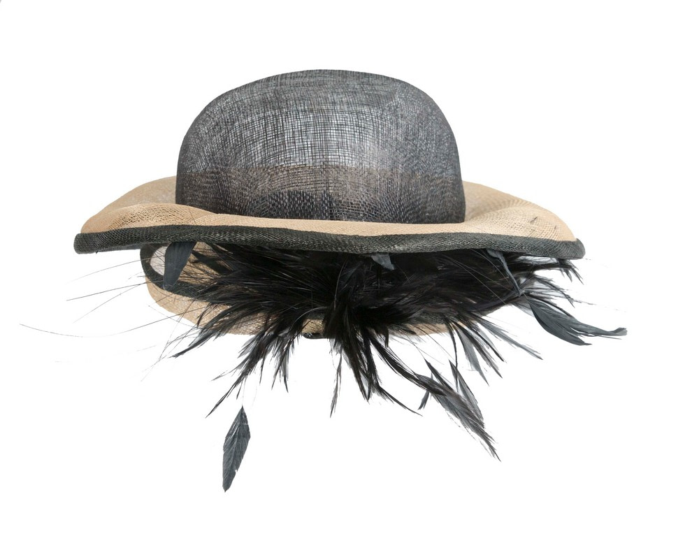 Exclusive sinamay vintage hat. Uniquely shaped brim with black outline and rich feather ornament.