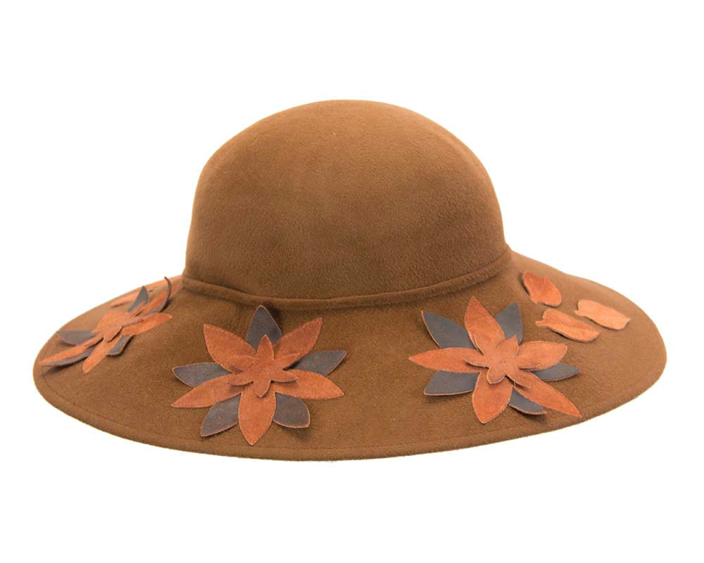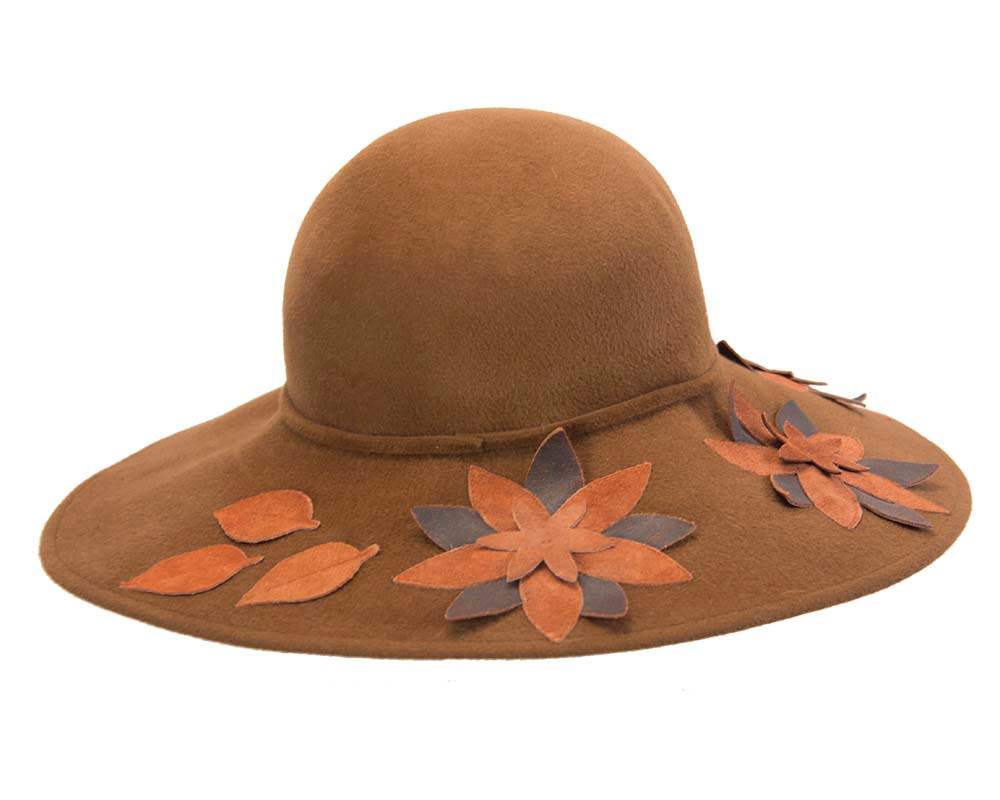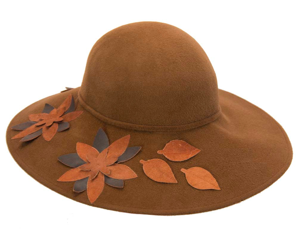 Hats is made from 100% rabbit fur. Gorgeous wide brim hat with leather flowers